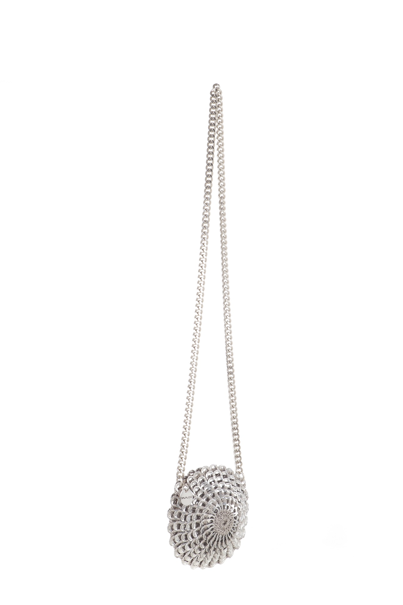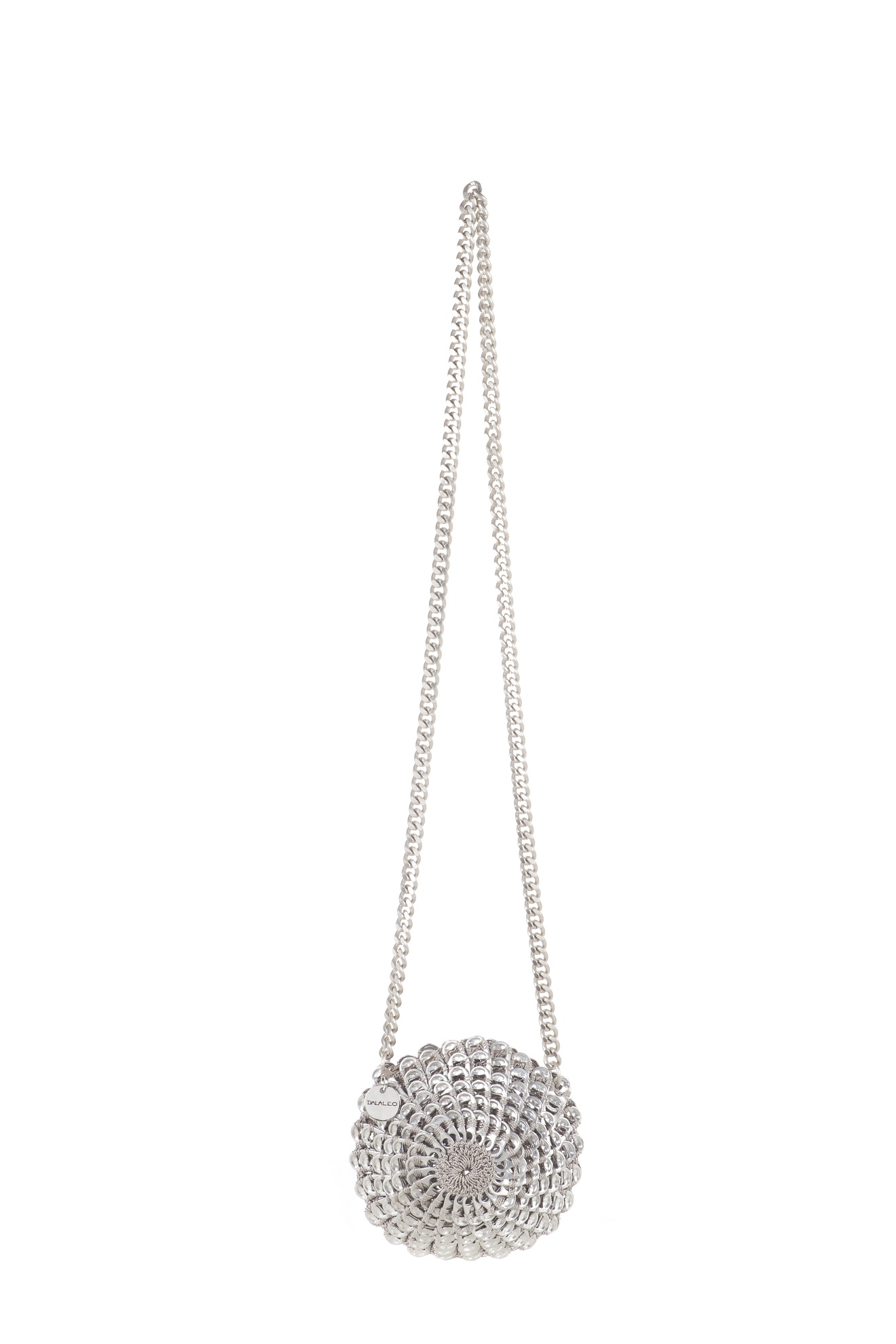 Borsa fatta a mano con linguette delle lattine riciclate e creata con la tecnica dell’uncinetto utilizzando filo di nylon color beige. Di forma rotonda con chiusura a zip e lunga tracolla in catena metallica (nichel free).