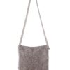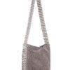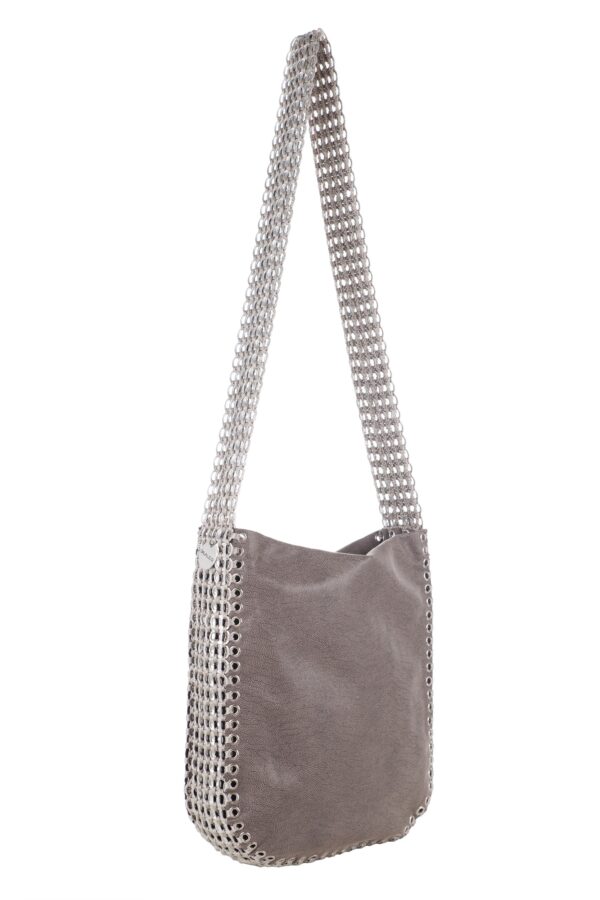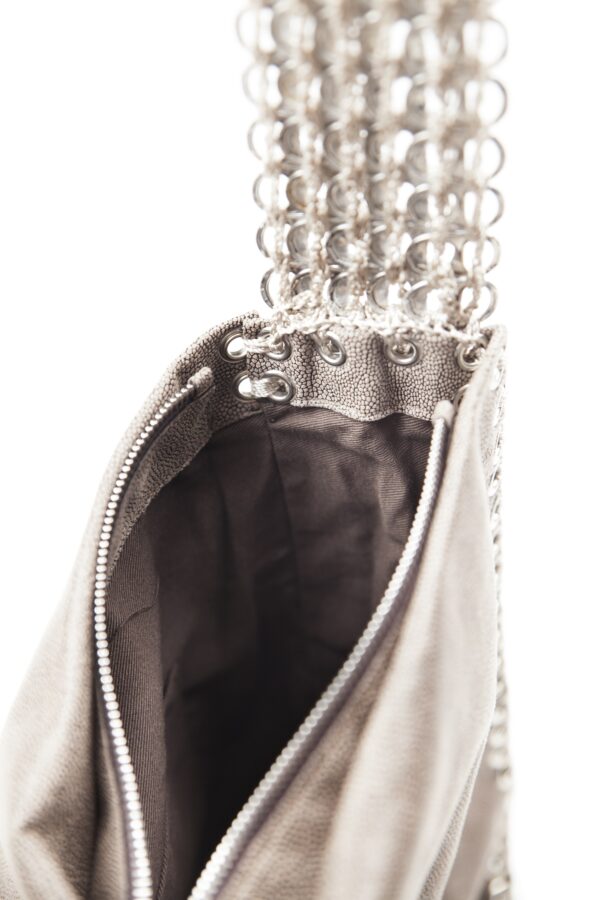 Borsa fatta a mano con linguette delle lattine riciclate e creata con la tecnica dell’uncinetto utilizzando filo di nylon color beige. Il corpo centrale della borsa è realizzato in tessuto effetto pelle scamosciata.