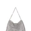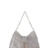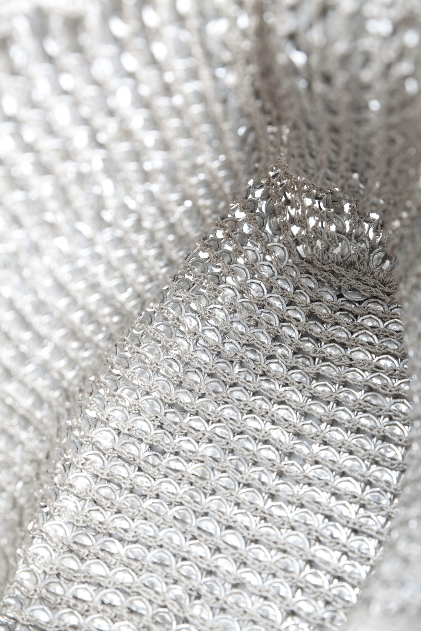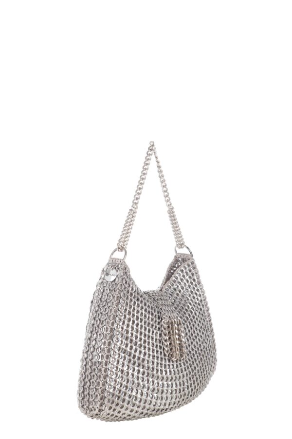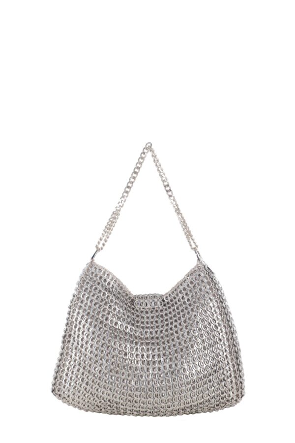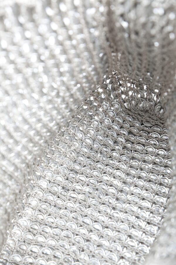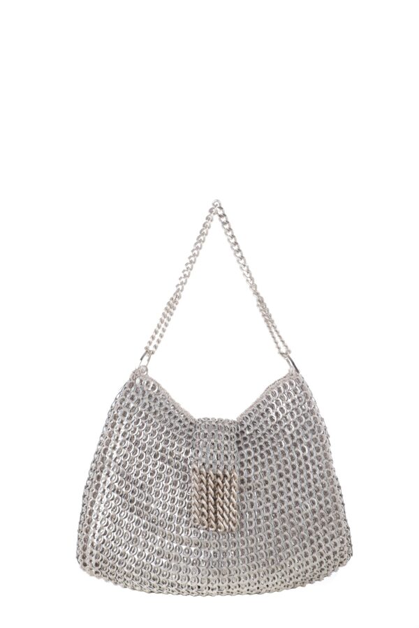 Borsa realizzata a mano con linguette della lattine riciclate assemblate con filo di nylon colore beige con la tecnica dell’uncinetto. Il manico è realizzato con catena metallica (nichel free) e la chiusura in linguette e catene.