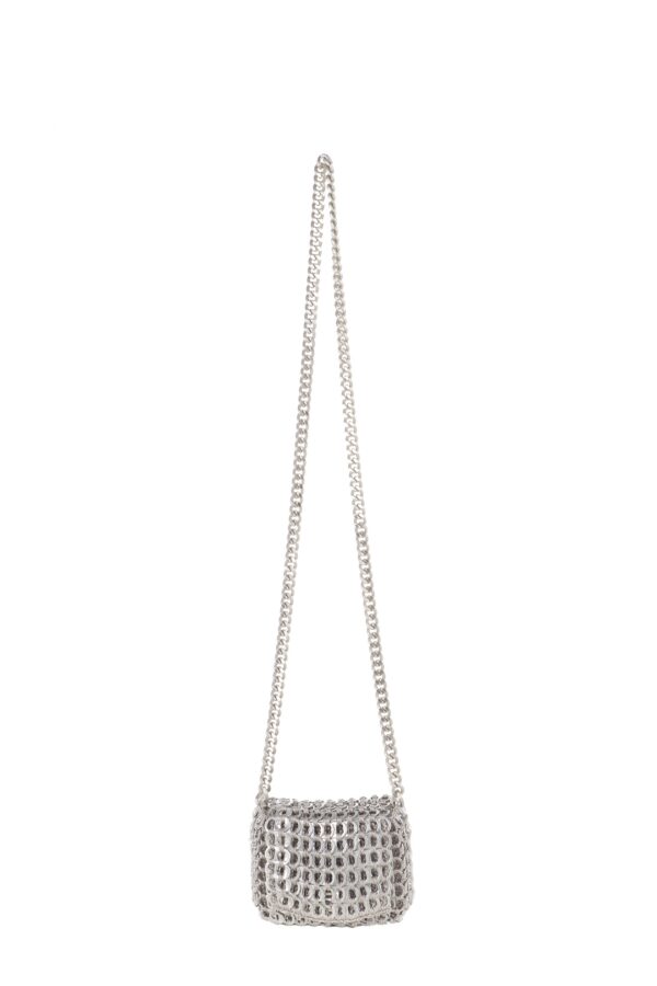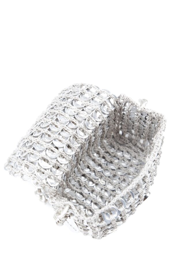 Borsa fatta a mano con linguette delle lattine riciclate e creata con la tecnica dell’uncinetto utilizzando filo di nylon color beige. Di forma quadrata con chiusura a calamita e lunga tracolla in catena metallica (nickel free).