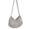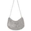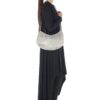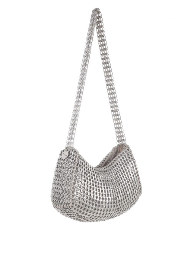 Borsa realizzata a mano con linguette della lattine riciclate assemblate con filo di nylon colore beige con la tecnica dell’uncinetto. la forma è a fagiolo. La tracolla è anch’essa realizzata in linguette. La borsa è chiusa con zip cucita su una base lavorata all’uncinetto.
