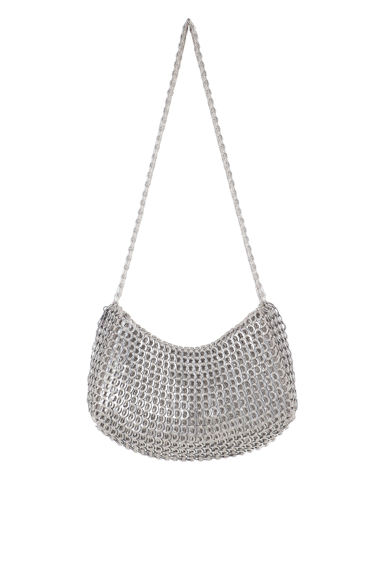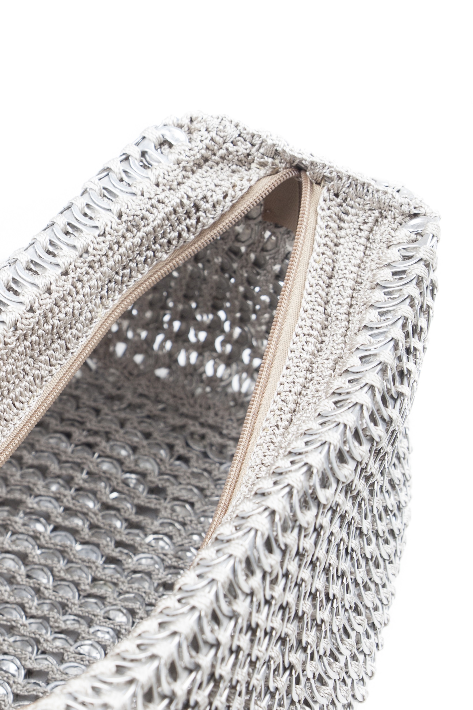 Borsa realizzata a mano con linguette della lattine riciclate assemblate con filo di nylon colore beige con la tecnica dell’uncinetto. la forma è a fagiolo. La tracolla è anch’essa realizzata in linguette. La borsa è chiusa con zip cucita su una base lavorata all’uncinetto.