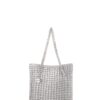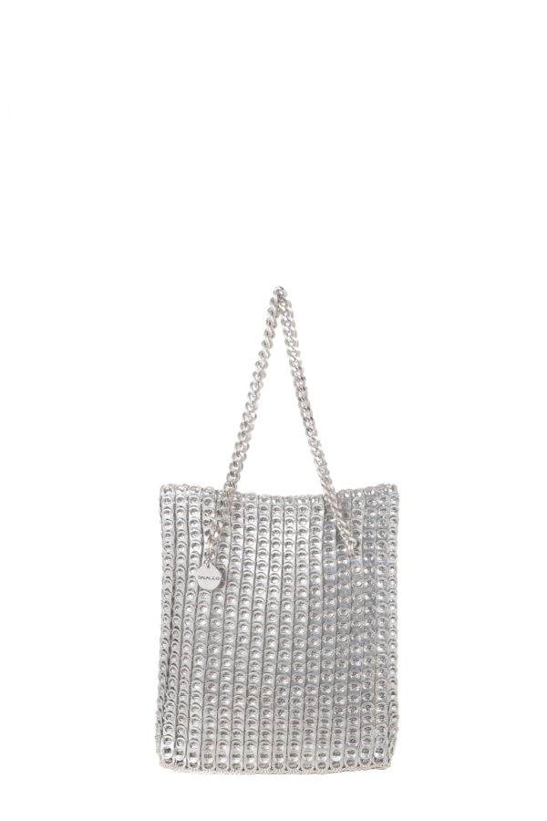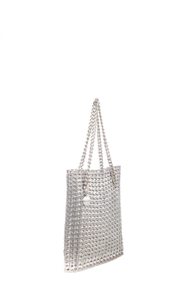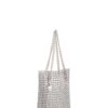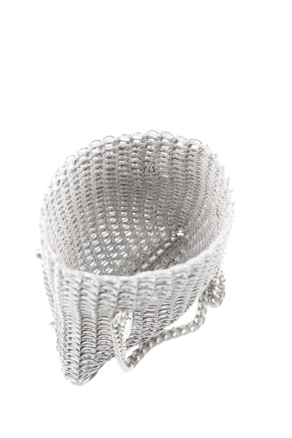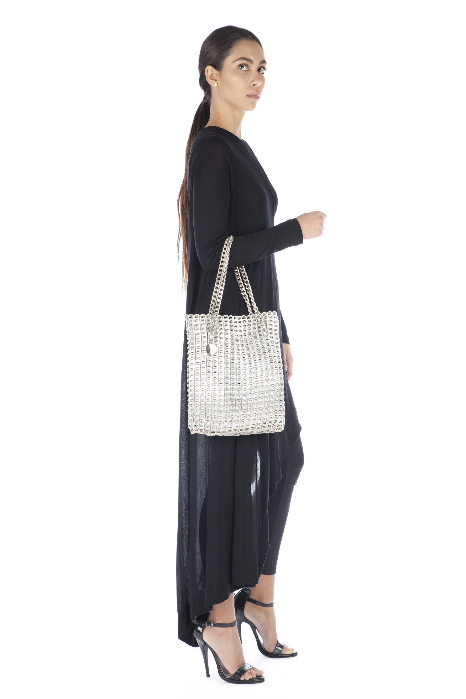 Borsa fatta a mano con linguette delle lattine riciclate e creata con la tecnica dell’uncinetto utilizzando filo di nylon color beige. Di forma rettangolare allungata e piatta. Manici realizzati in catena metallica (nichel free).
