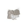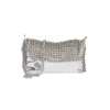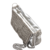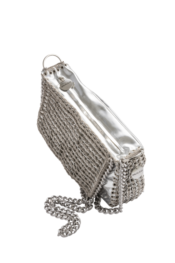 Borsa realizzata a mano in materiale silver effetto specchiato e linguette delle lattine riciclate, assemblate con filo di nylon con la tecnica dell’uncinetto. Di forma rettangolare rivestita in cotone con cerniera cucita sul tessuto e patta in linguette ricamata in catena metallica.