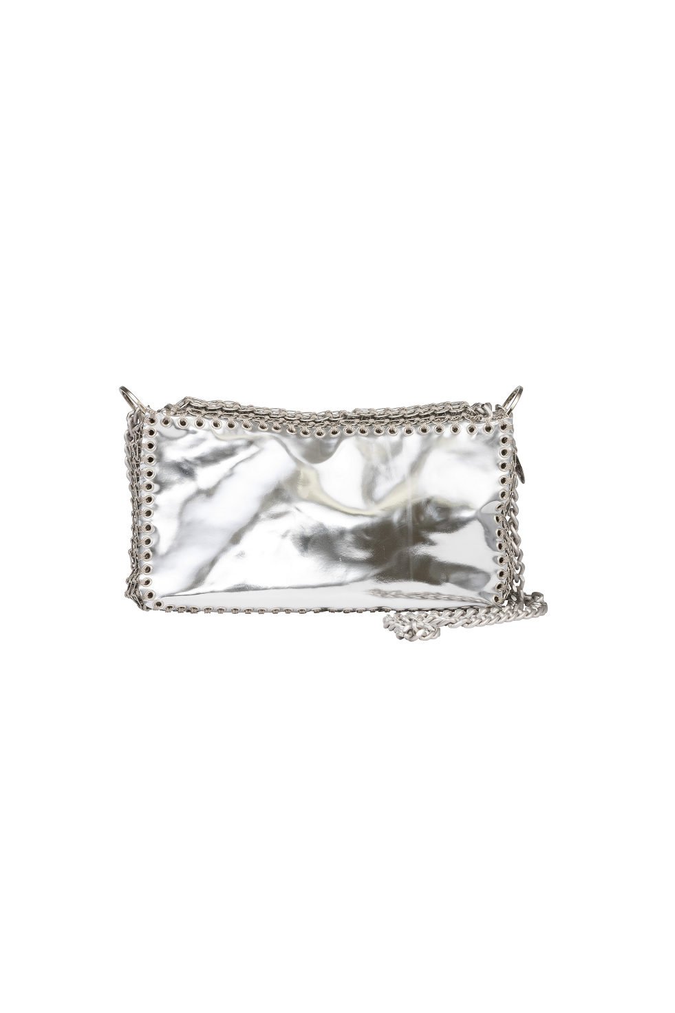 Borsa realizzata a mano in materiale silver effetto specchiato e linguette delle lattine riciclate, assemblate con filo di nylon con la tecnica dell’uncinetto. Di forma rettangolare rivestita in cotone con cerniera cucita sul tessuto e patta in linguette ricamata in catena metallica.