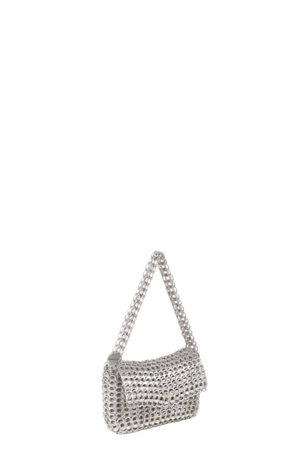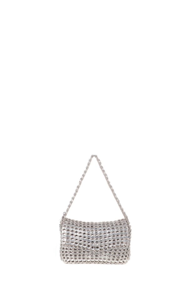 Borsa fatta a mano con linguette delle lattine riciclate e creata con la tecnica dell’uncinetto utilizzando filo di nylon color beige. Di forma rettangolare con modesta profondità laterale e patta a chiusura. La piccola tracolla è anch’essa in linguette.