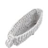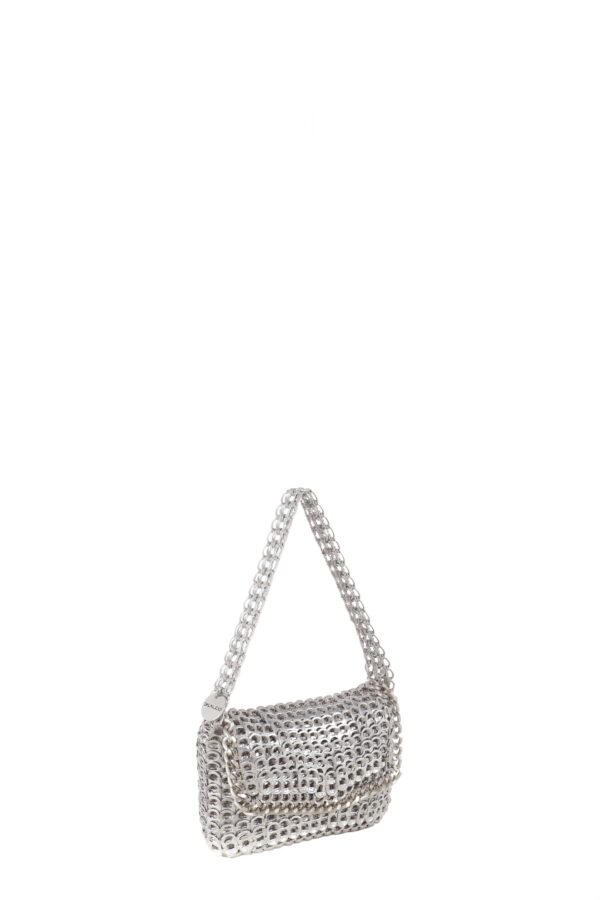 Borsa fatta a mano con linguette delle lattine riciclate e creata con la tecnica dell’uncinetto utilizzando filo di nylon color beige. Di forma rettangolare con modesta profondità laterale e patta a chiusura. La piccola tracolla è anch’essa in linguette. La patta è ricamata con catena metallica ( nickel free )