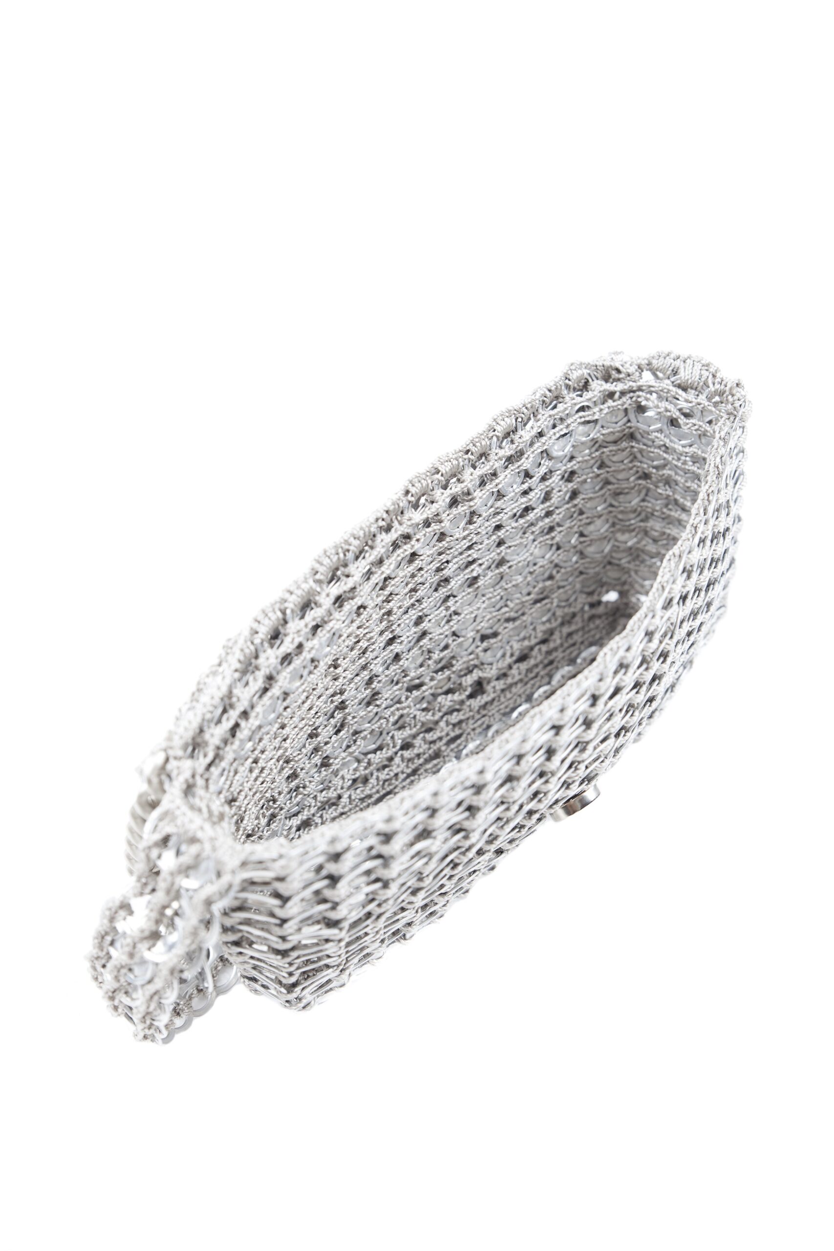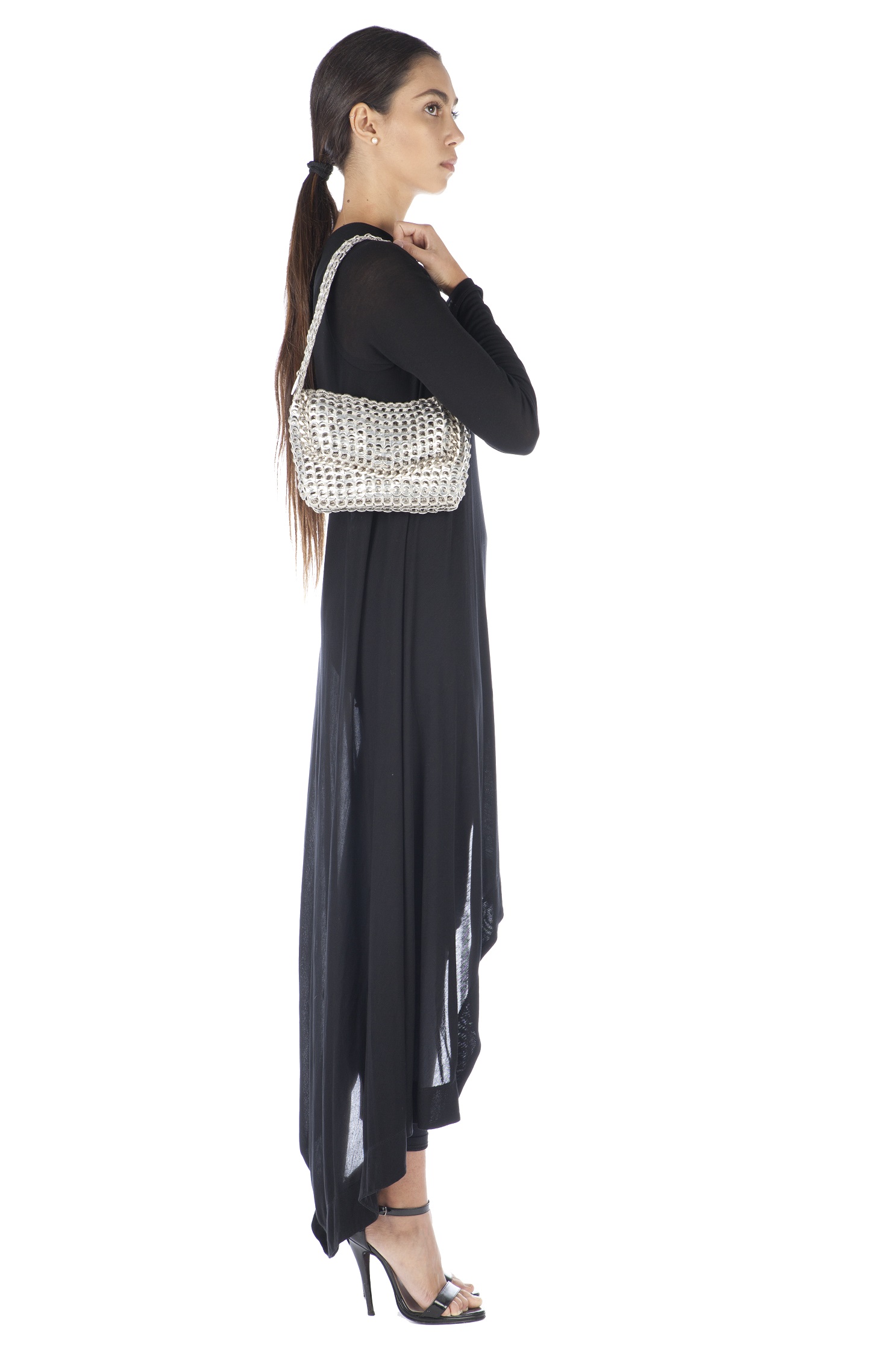 Borsa fatta a mano con linguette delle lattine riciclate e creata con la tecnica dell’uncinetto utilizzando filo di nylon color beige. Di forma rettangolare con modesta profondità laterale e patta a chiusura. La piccola tracolla è anch’essa in linguette. La patta è ricamata con catena metallica ( nickel free )