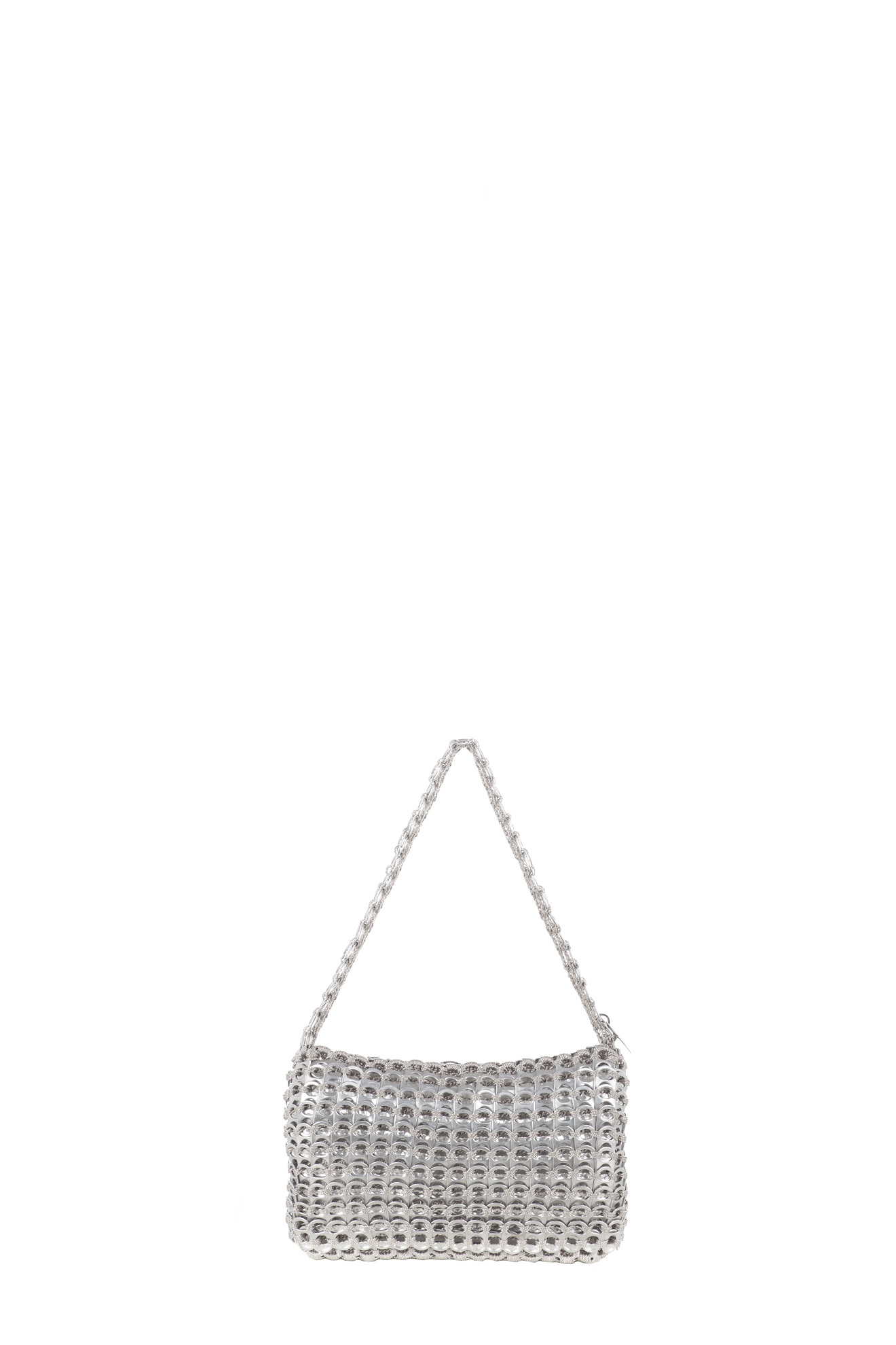 Borsa fatta a mano con linguette delle lattine riciclate e creata con la tecnica dell’uncinetto utilizzando filo di nylon color beige. Di forma rettangolare con modesta profondità laterale e patta a chiusura. La piccola tracolla è anch’essa in linguette.