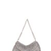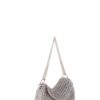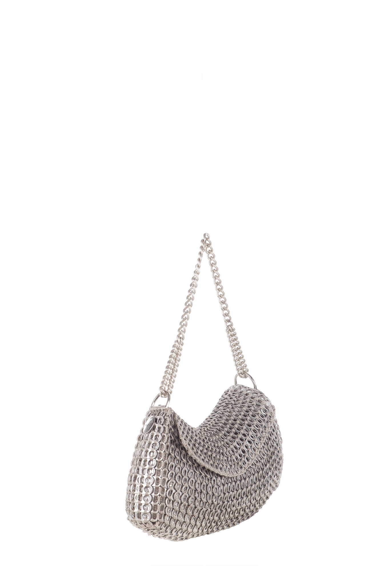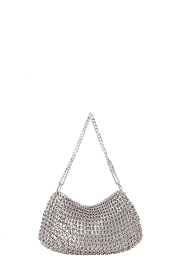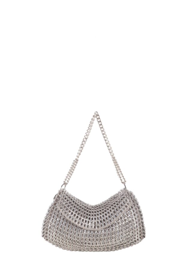 Borsa fatta a mano con linguette delle lattine riciclate e creata con la tecnica dell’uncinetto utilizzando filo di nylon color beige. La forma è rettangolare con grande profondità con patta a chiusura e calamita. La corta tracolla doppia è in catena metallica nickel free.