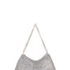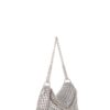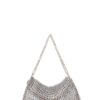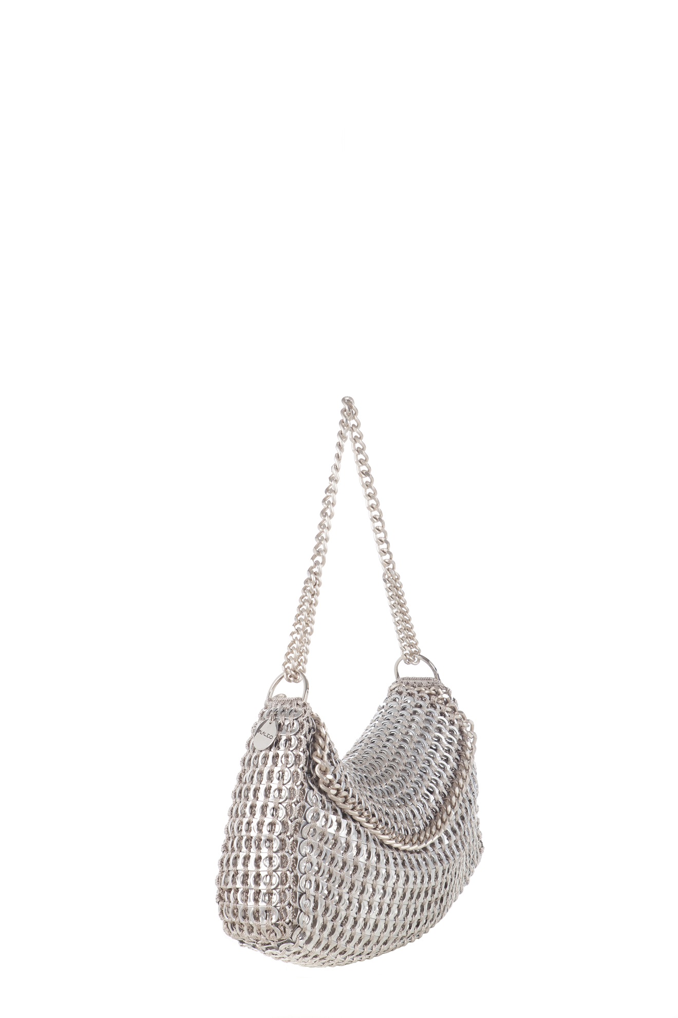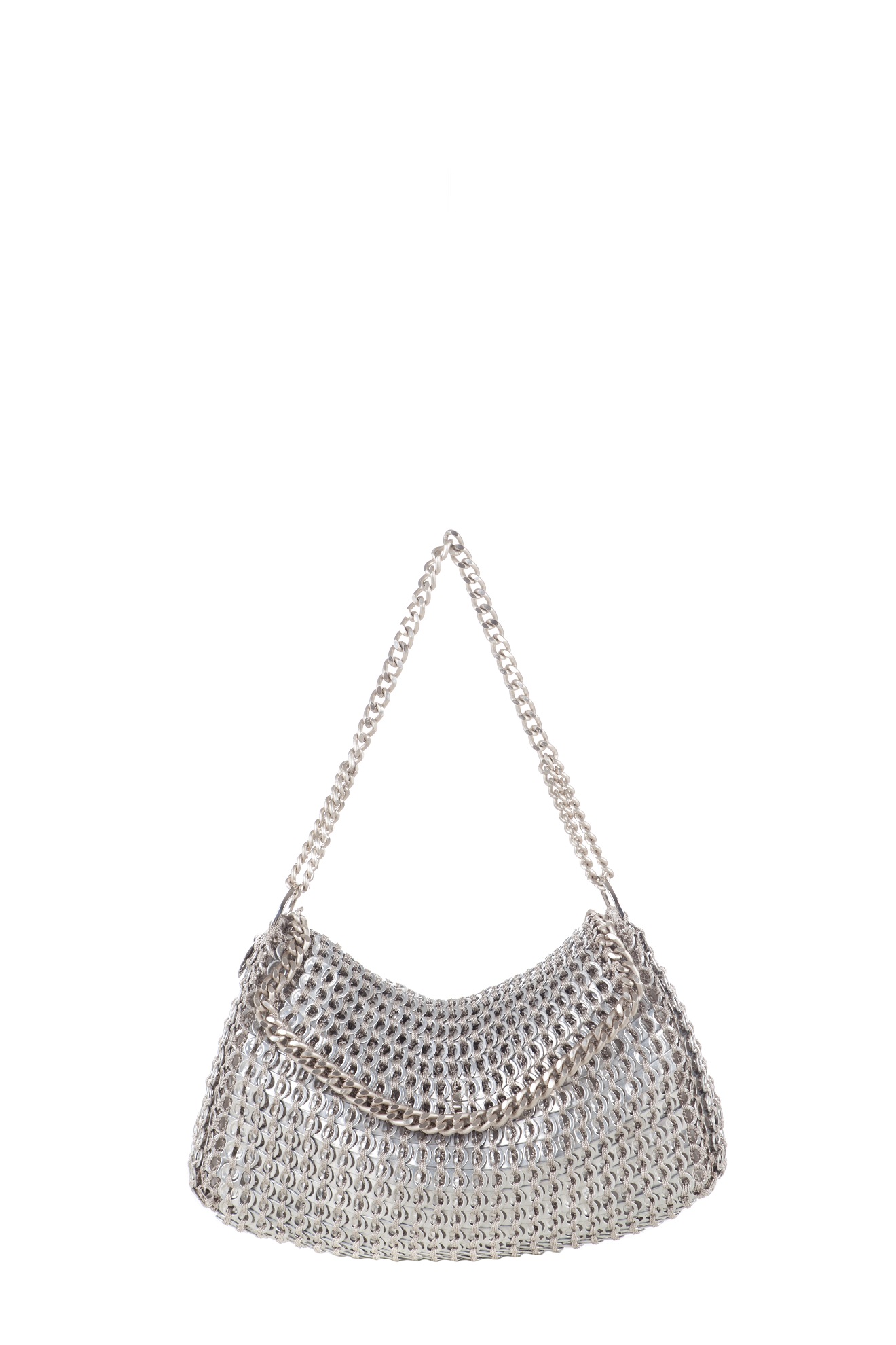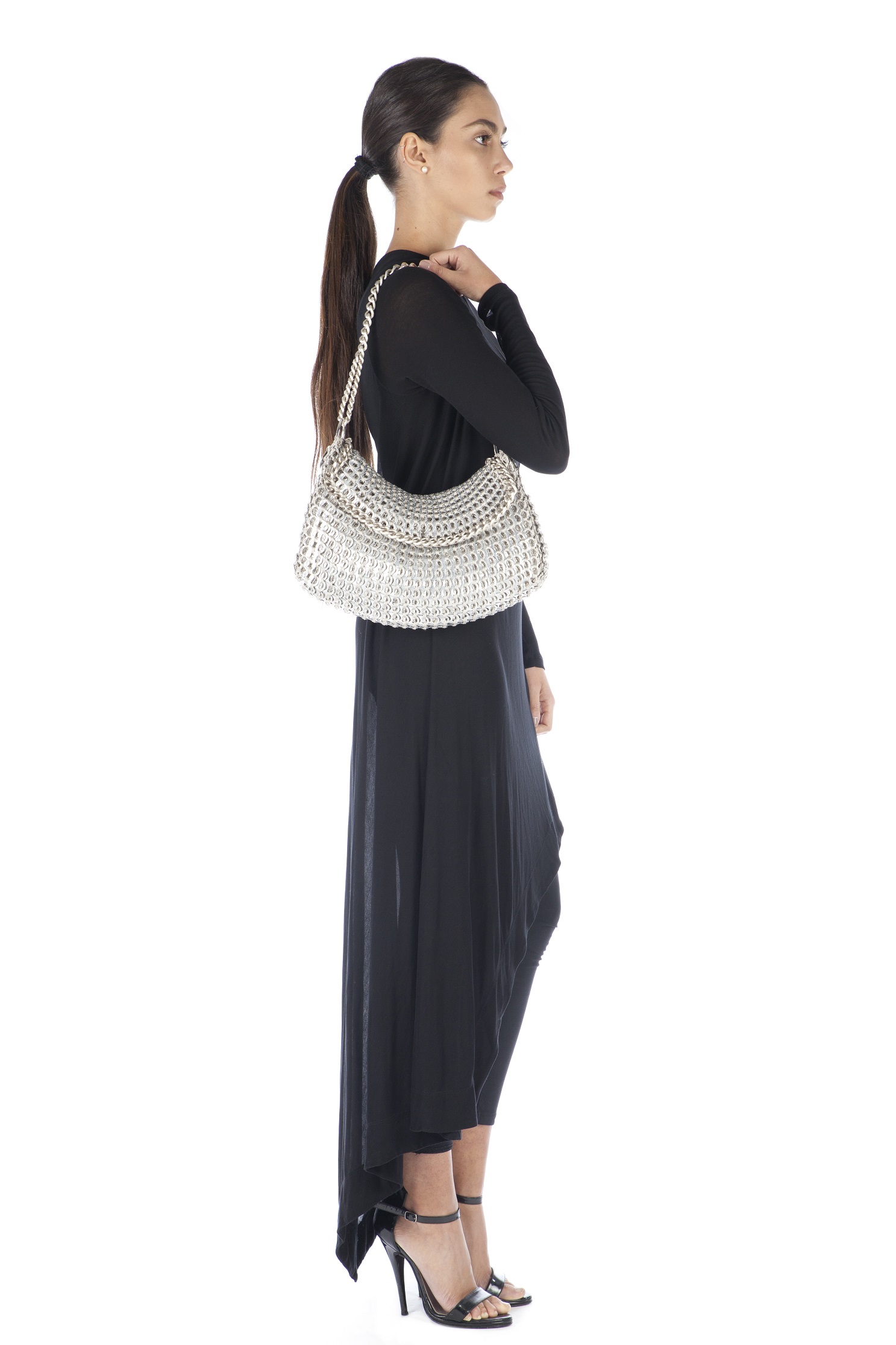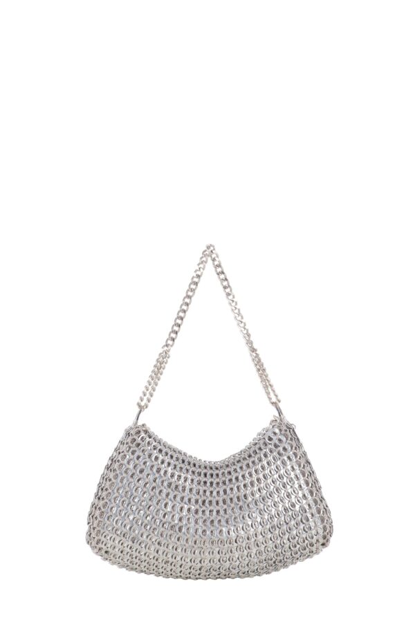 Borsa fatta a mano con linguette delle lattine riciclate e creata con la tecnica dell’uncinetto utilizzando filo di nylon color beige. La forma è rettangolare con grande profondità, con patta a chiusura e calamita. La corta tracolla doppia è in catena metallica e la patta è ricamata con la stessa catena metallica (nickel free).