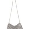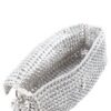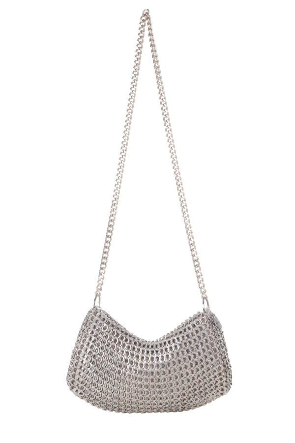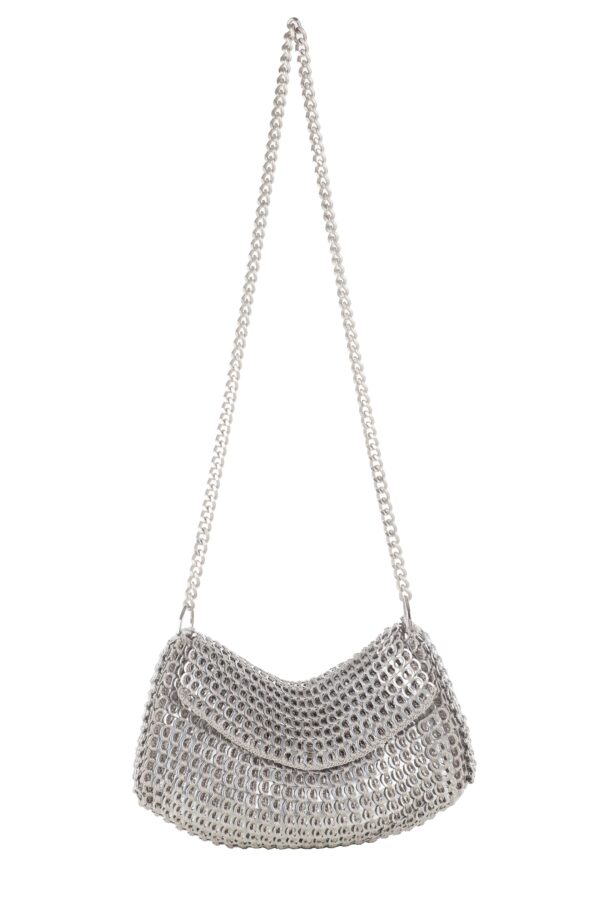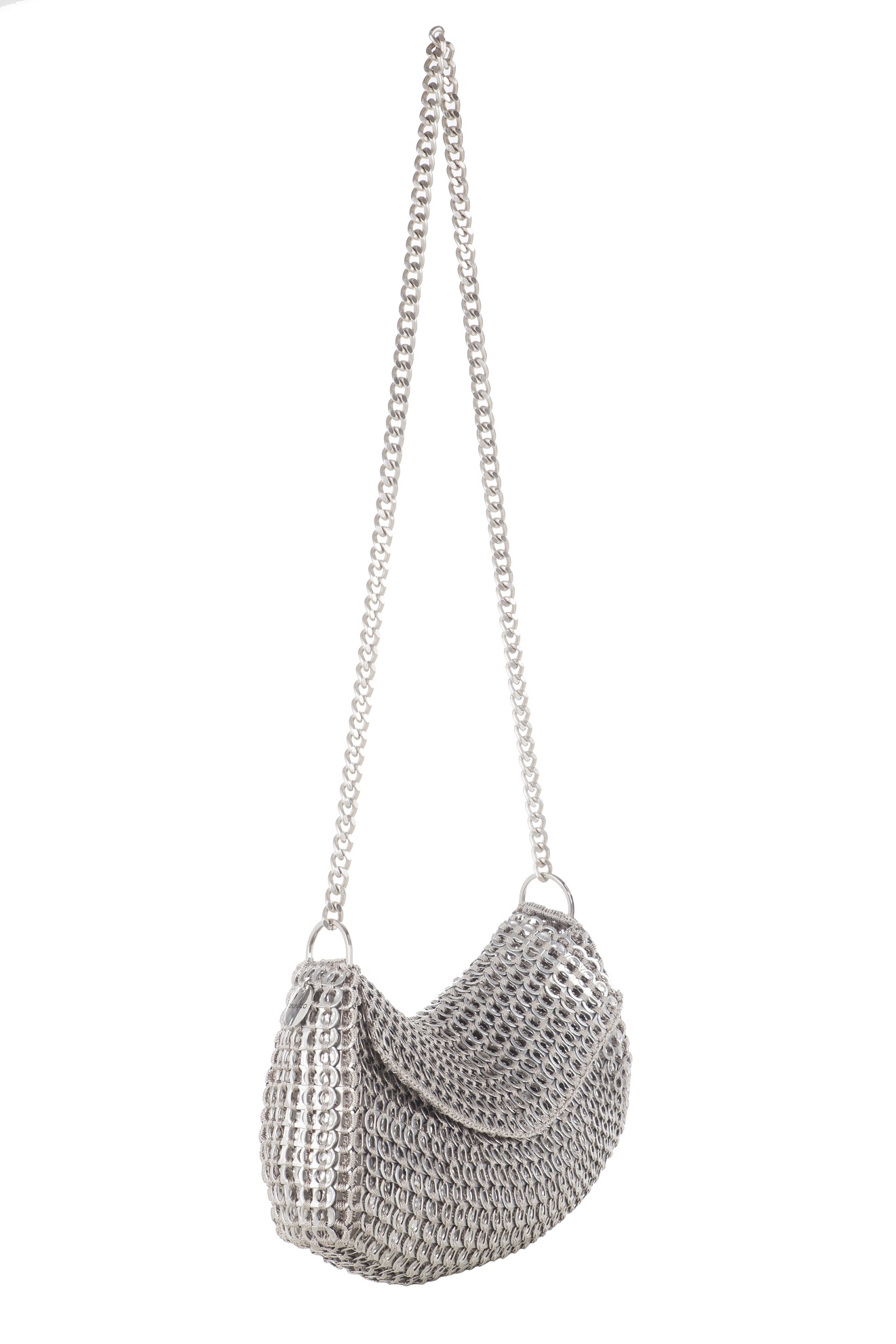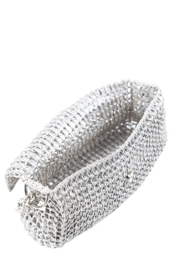 Borsa fatta a mano con linguette delle lattine riciclate e creata con la tecnica dell’uncinetto utilizzando filo di nylon color beige. La forma è rettangolare con grande profondità, con patta a chiusura e calamita. La lunga tracolla è in catena metallica (nickel free).