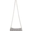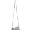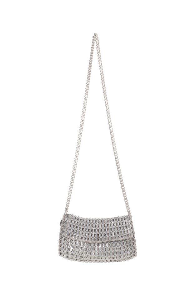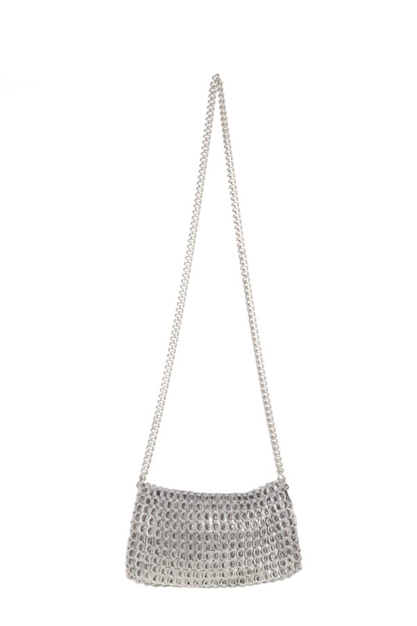 Borsa fatta a mano con linguette delle lattine riciclate e creata con la tecnica dell’uncinetto utilizzando filo di nylon color beige. La forma è rettangolare con discreta profondità con patta a chiusura. La lunga tracolla è in catena metallica (nickel free).