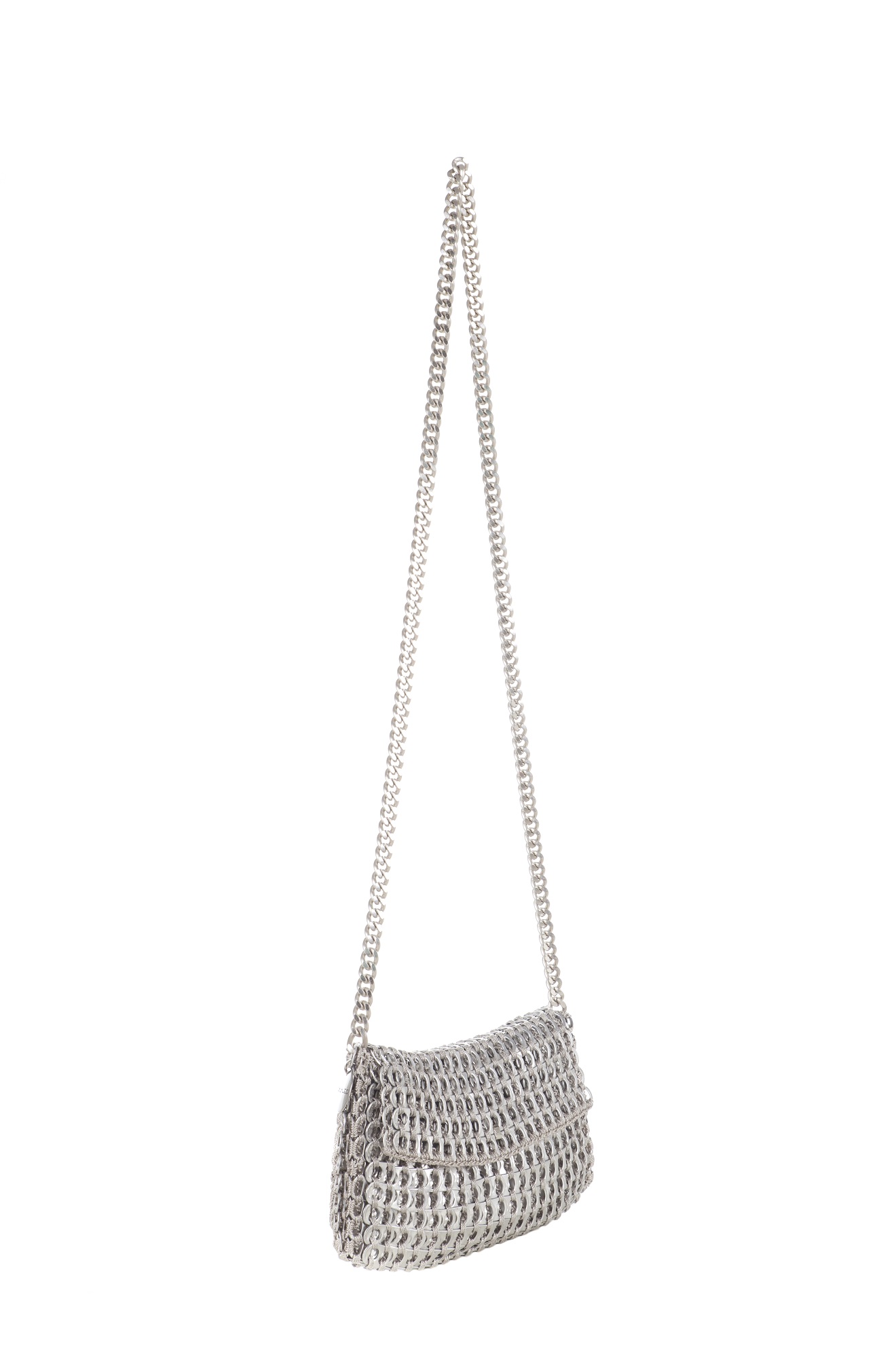 Borsa fatta a mano con linguette delle lattine riciclate e creata con la tecnica dell’uncinetto utilizzando filo di nylon color beige. La forma è rettangolare con discreta profondità con patta a chiusura. La lunga tracolla è in catena metallica (nickel free).