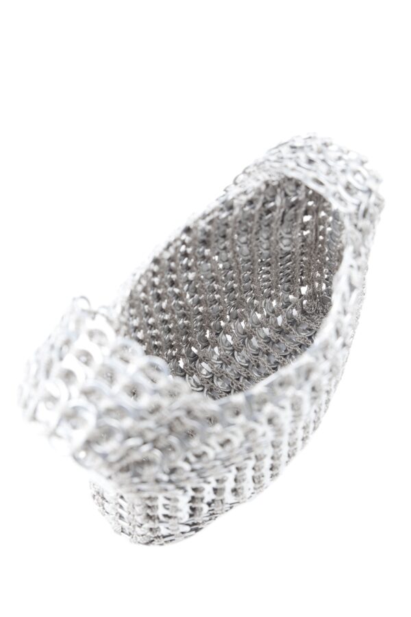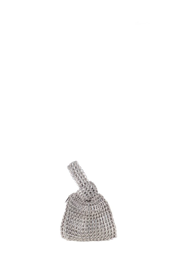 Borsa fatta a mano con linguette delle lattine riciclate e creata con la tecnica dell’uncinetto utilizzando filo di nylon color beige. Di forma triangolare quando indossata e quadrata quando aperta. Infilando un’asola dentro l’altra si chiude ermeticamente.
