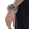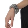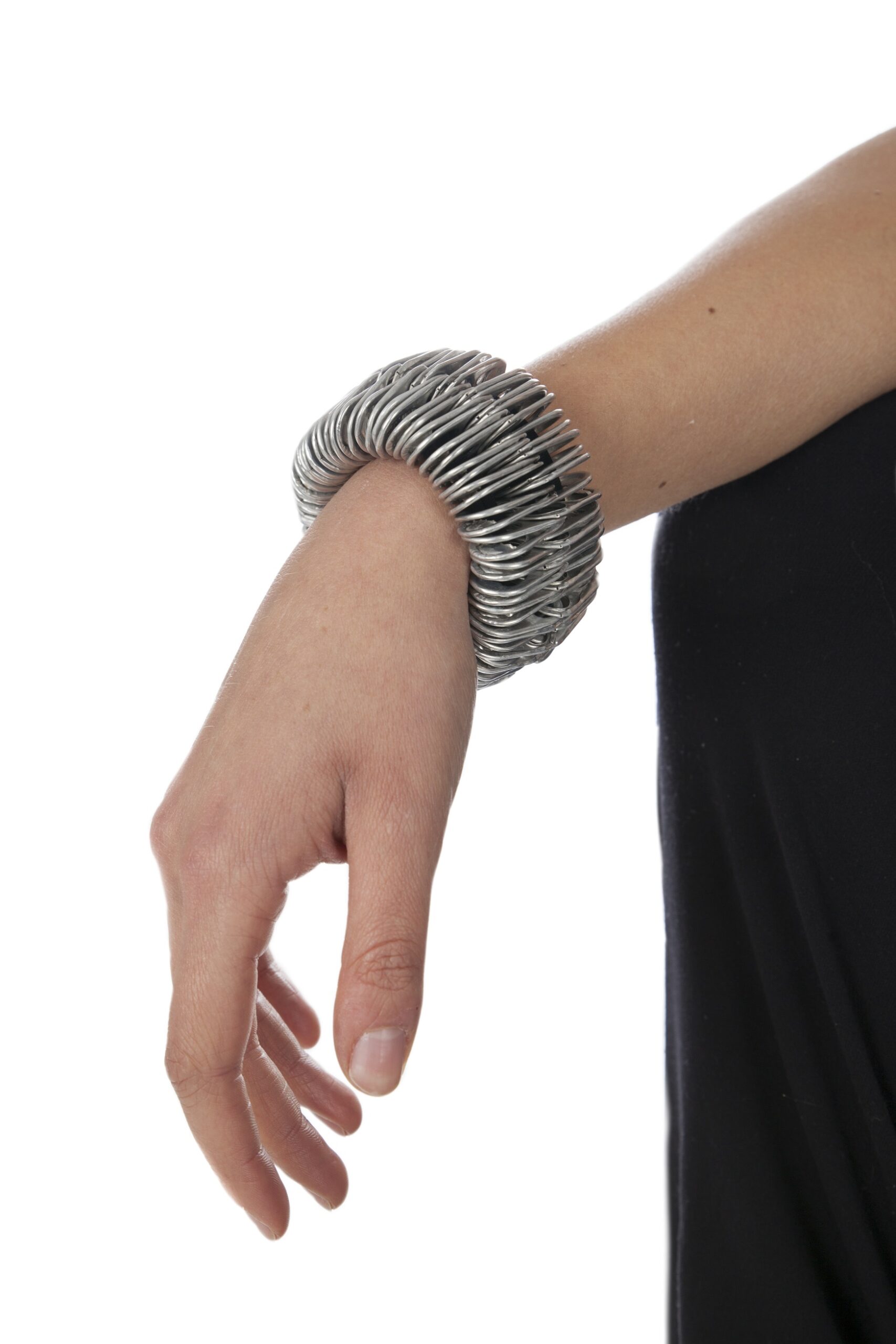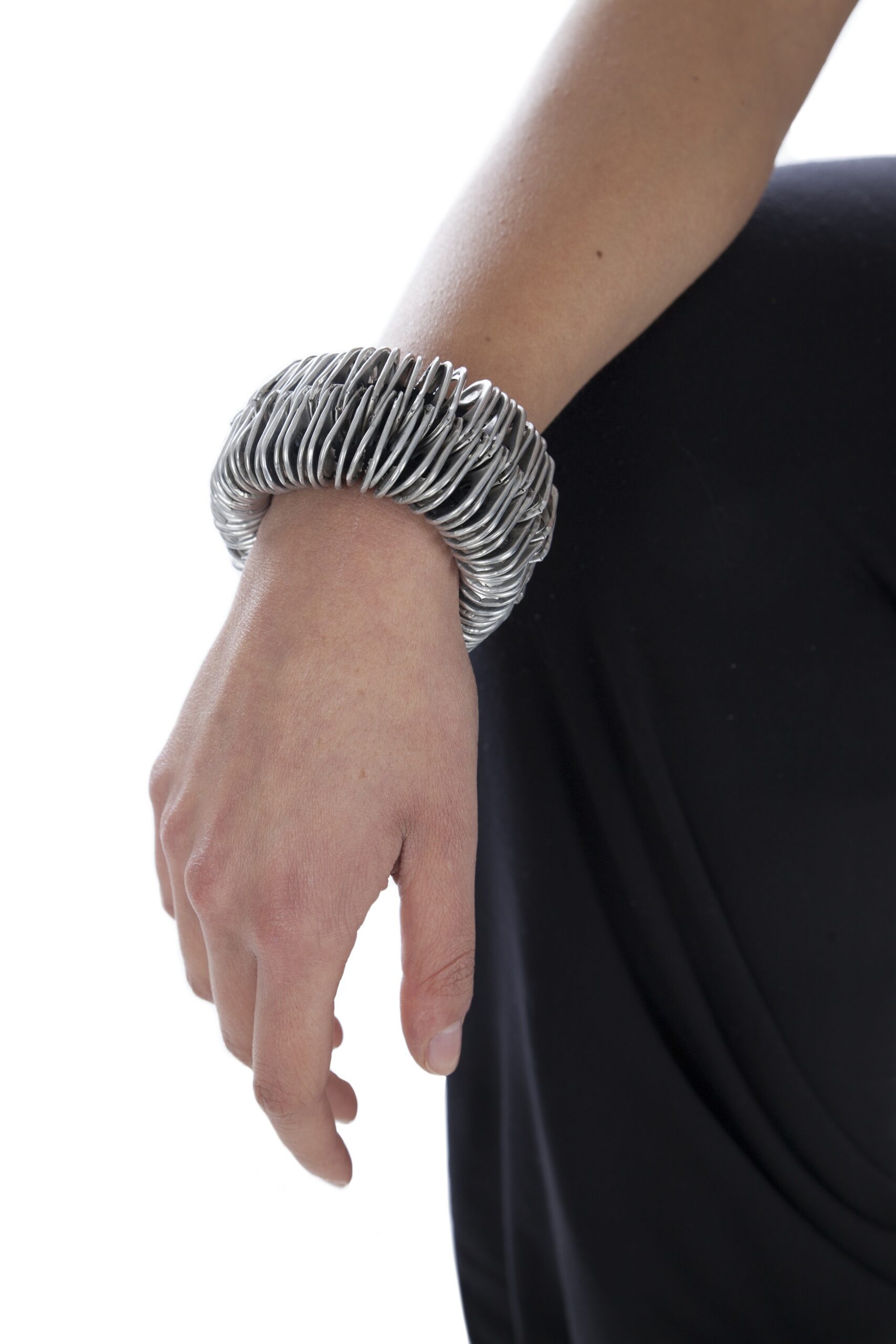 Braccialetto realizzato a mano con le linguette riciclate con la tecnica dell’uncinetto, utilizzando filo di colore grigio.