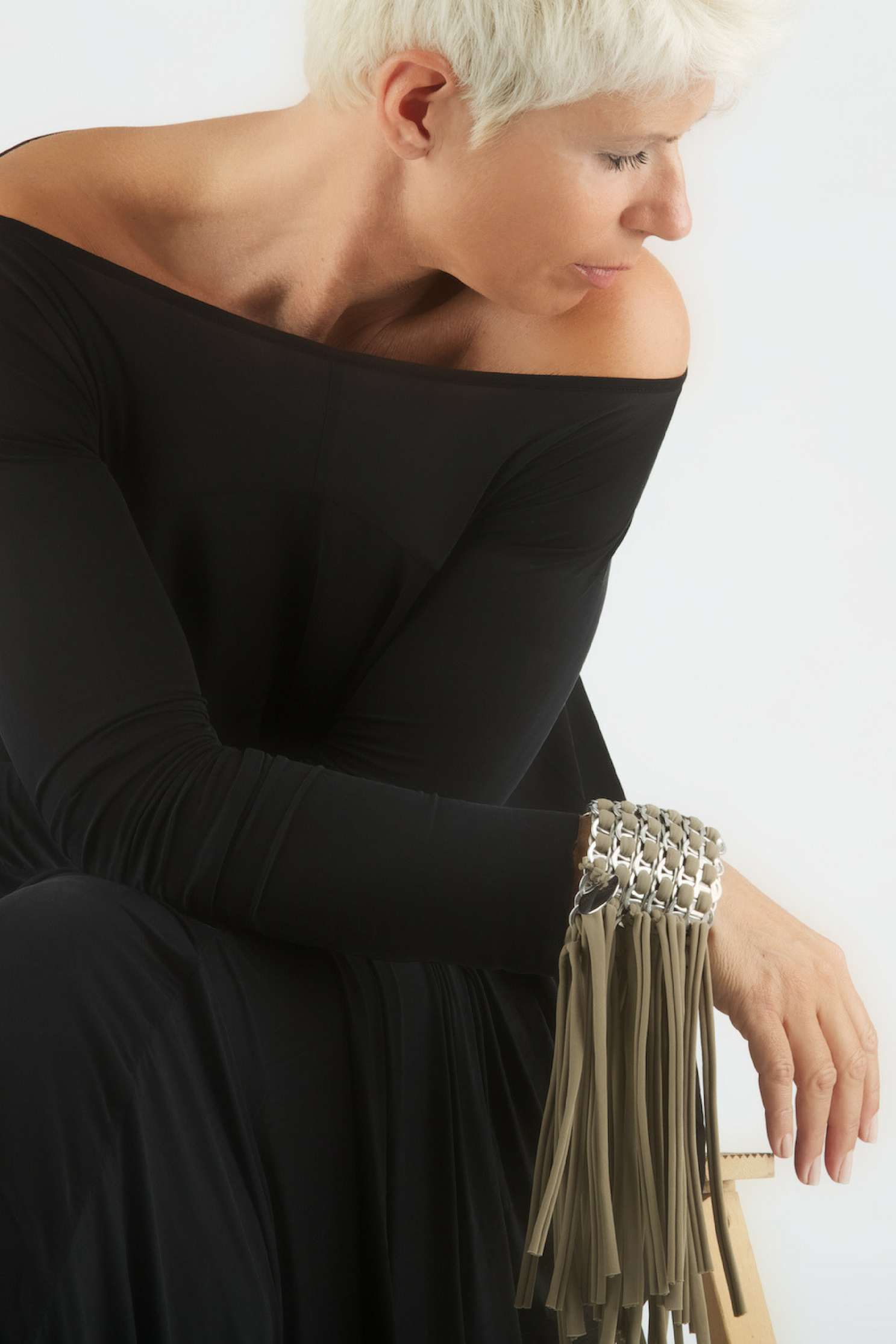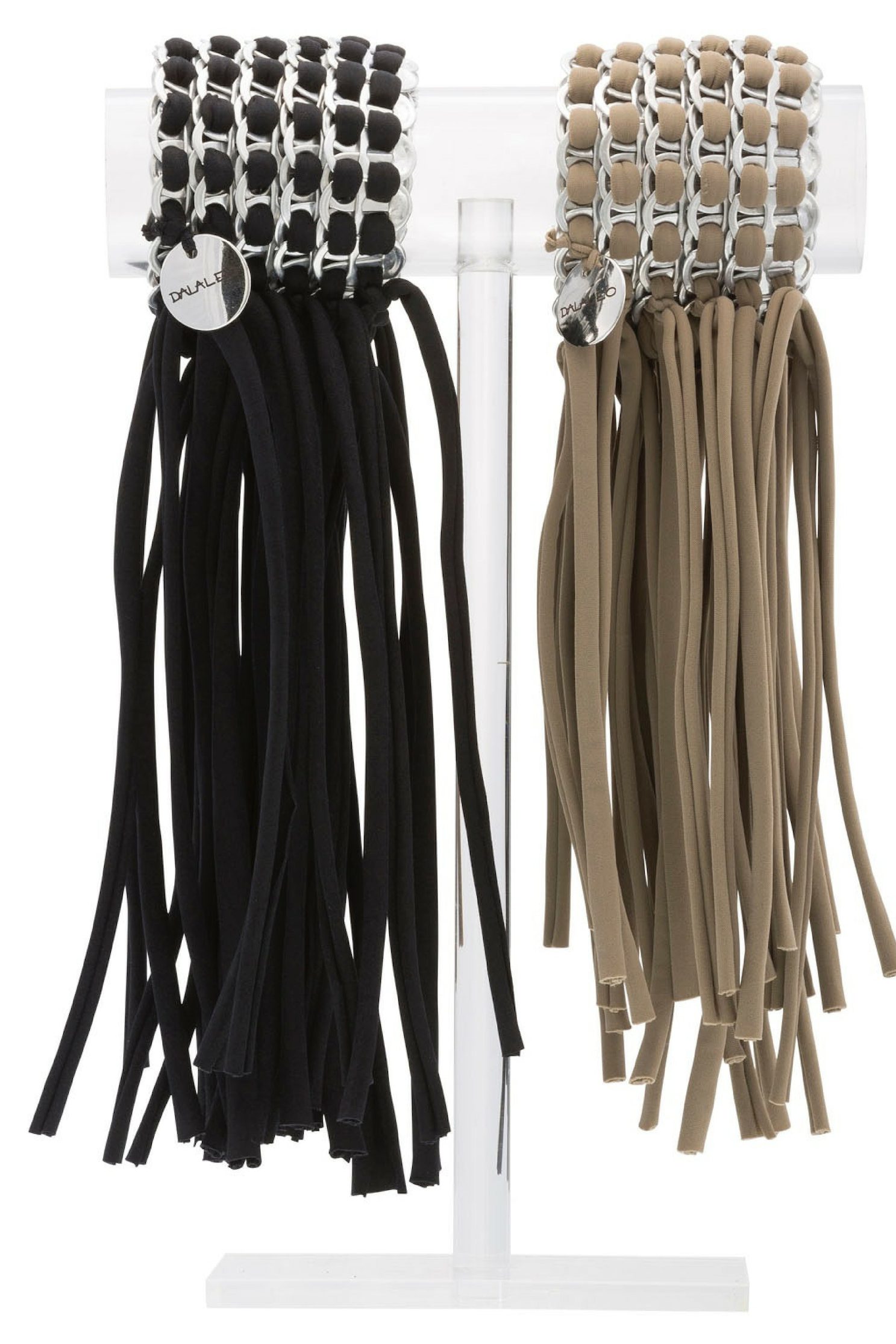 Bracciale fatto a mano con linguette delle lattine riciclate intrecciando fili di lycra.