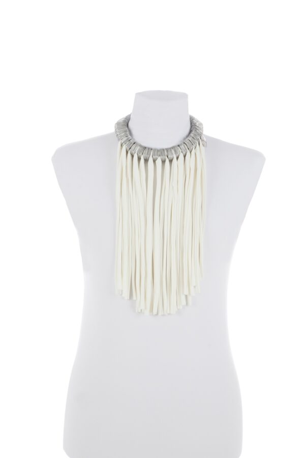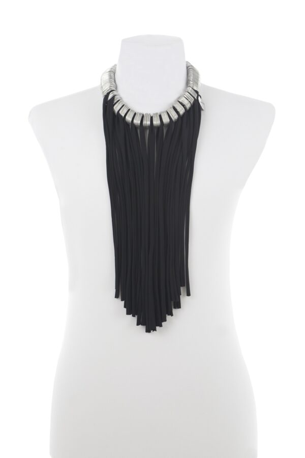 Collana realizzata a mano in Italia con lycra e linguette in alluminio intrecciate.
