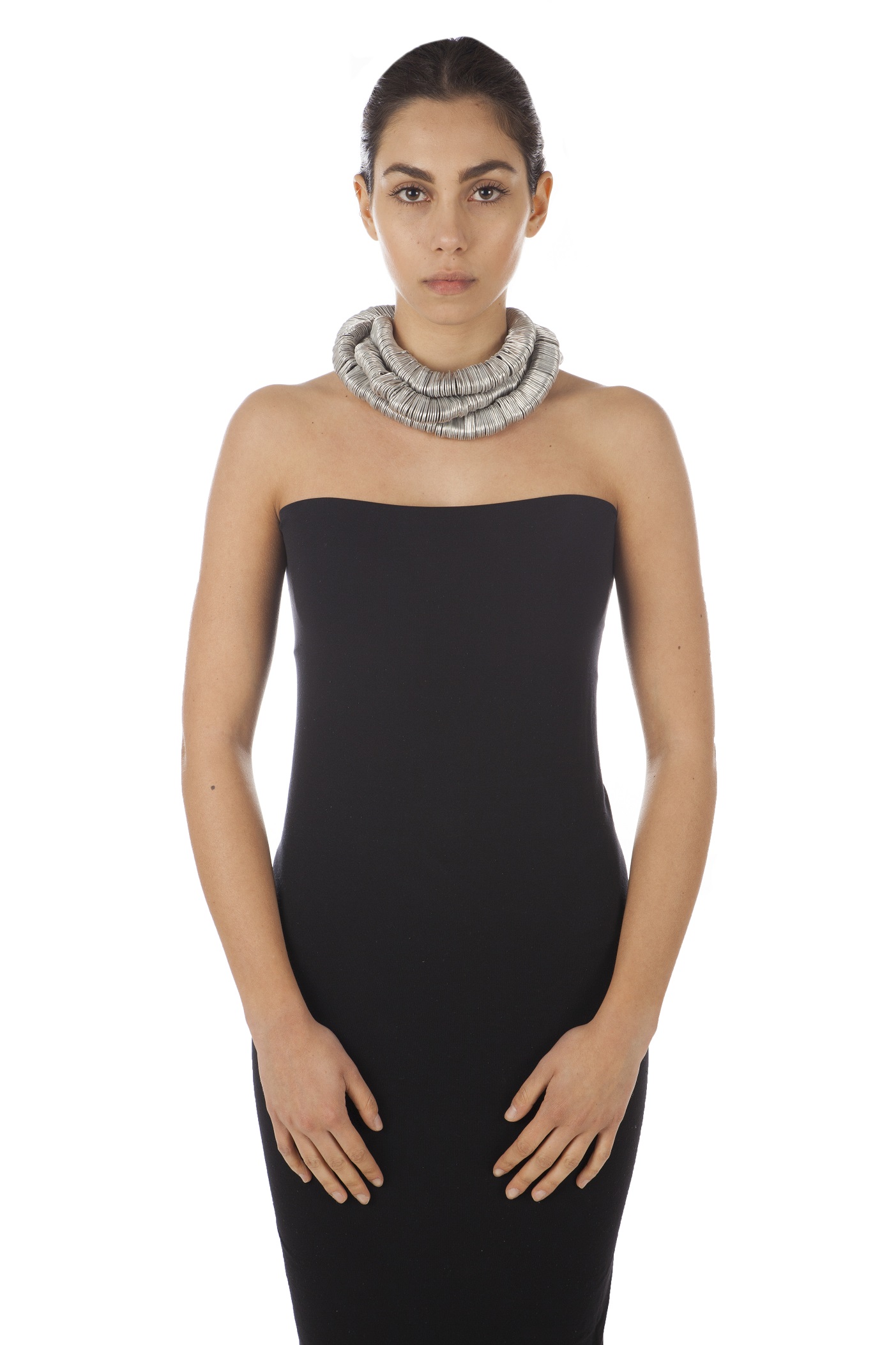 Il consiglio della designer: è un accessorio passepartout, ideale per tantissime situazioni, perfetta con un maglione di lana così come con un tubino rigoroso. La presenza al suo interno di un’anima elastica permette di giocare con la collana arrotolandola sul collo a proprio piacere.
