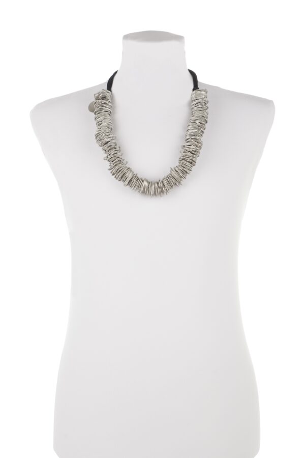 Collana realizzata a mano con linguette delle lattine riciclate e infilate in maniera irregolare utilizzando filo di lycra