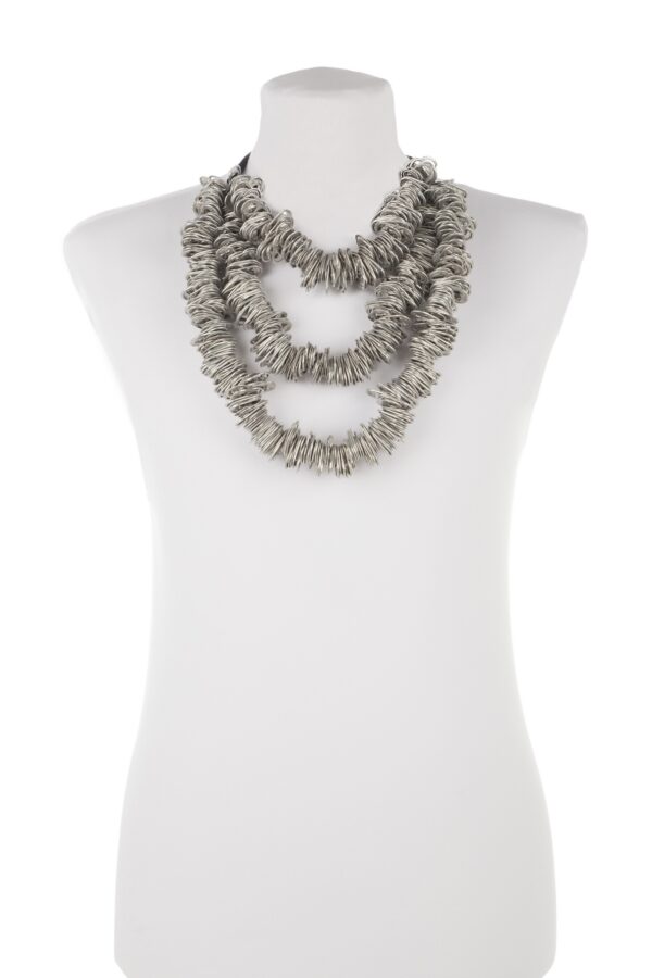 Collana realizzata a mano con 3 giri di linguette delle lattine riciclate, infilate in maniera irregolare utilizzando filo di lycra.