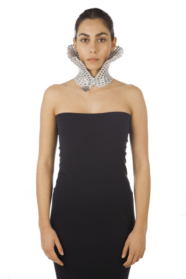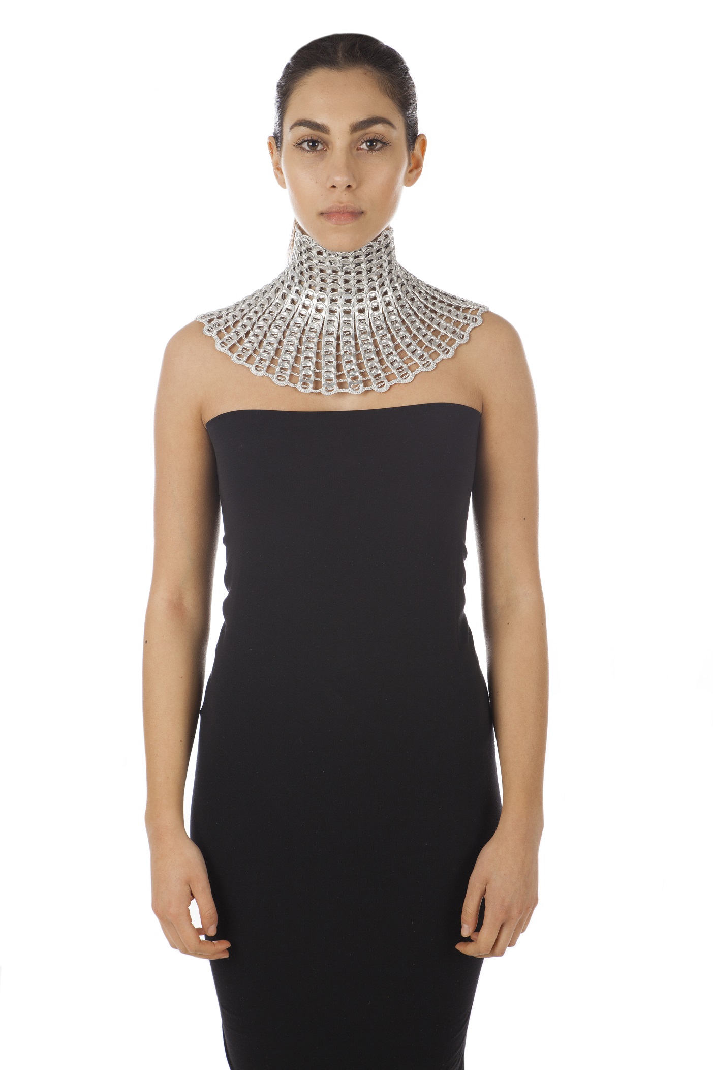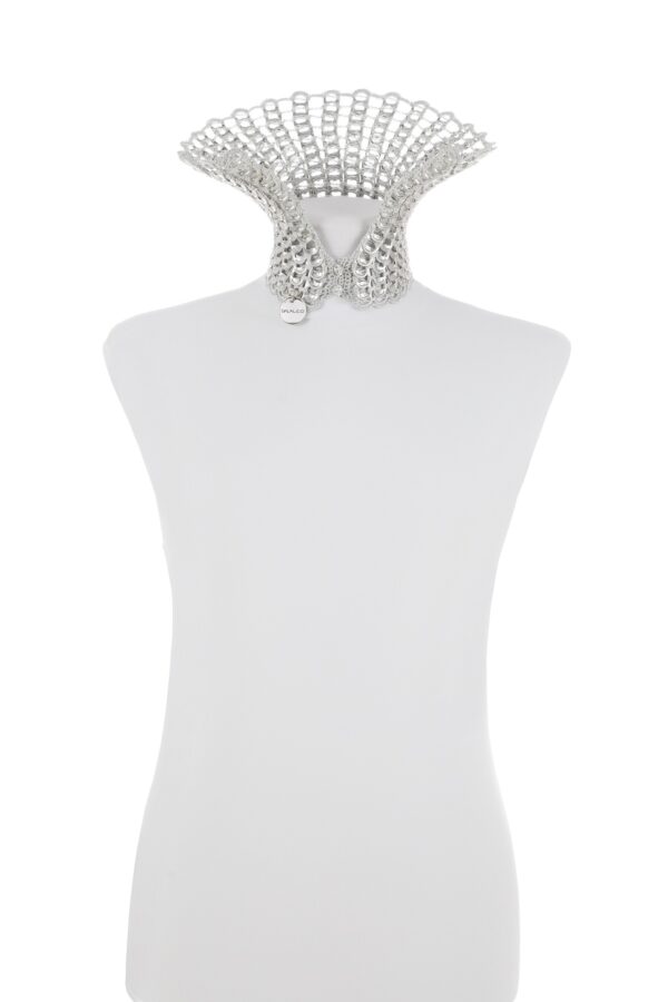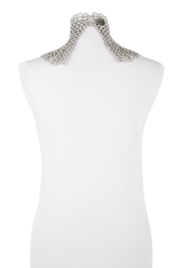 Collana realizzata a mano con linguette riciclate creata con la tecnica dell’uncinetto utilizzando filo di colore grigio chiaro. La chiusura è permessa da due bottoni gioiello in Swarovski.