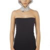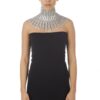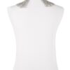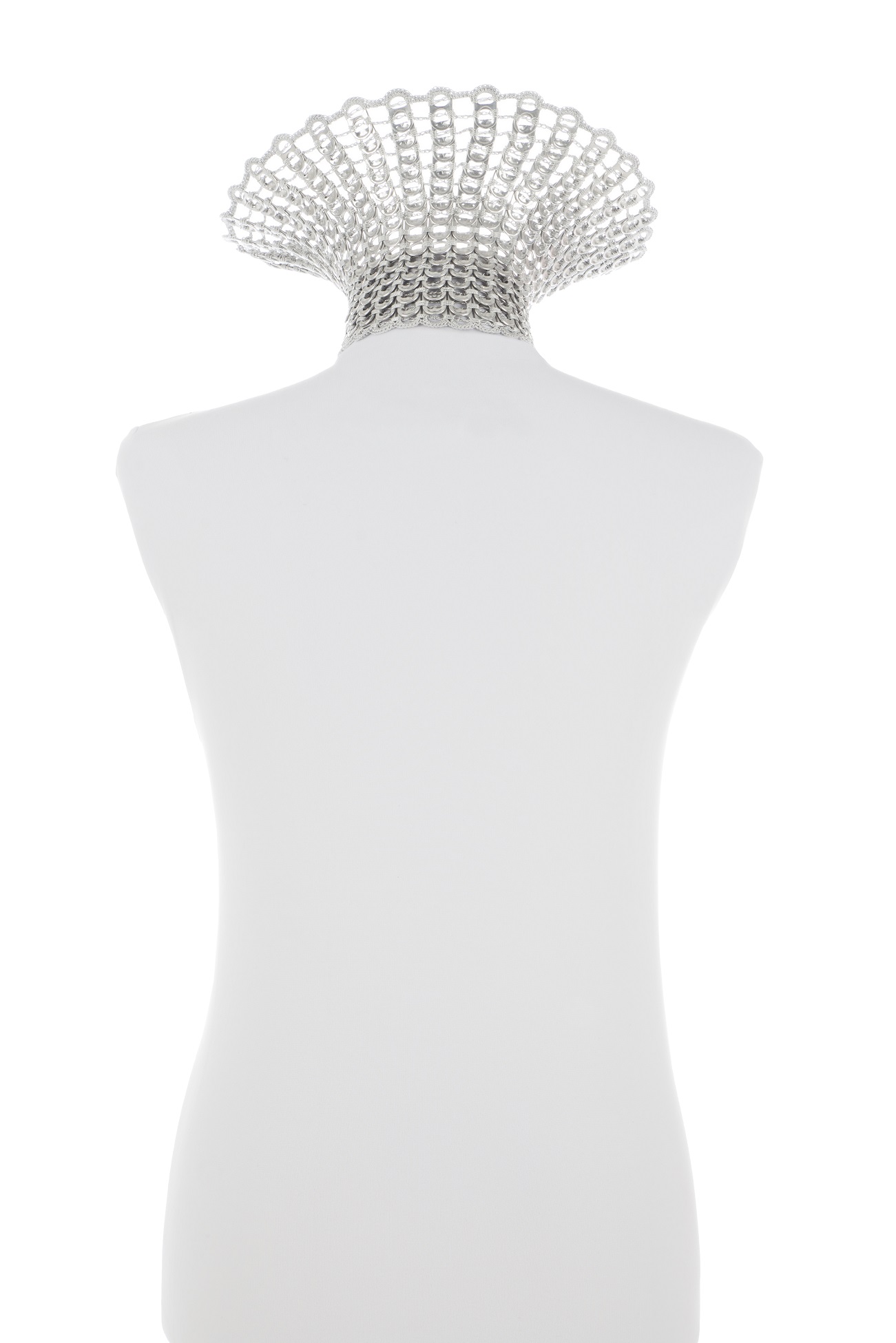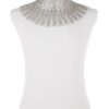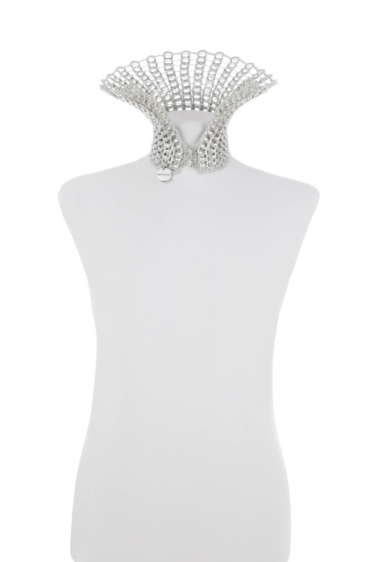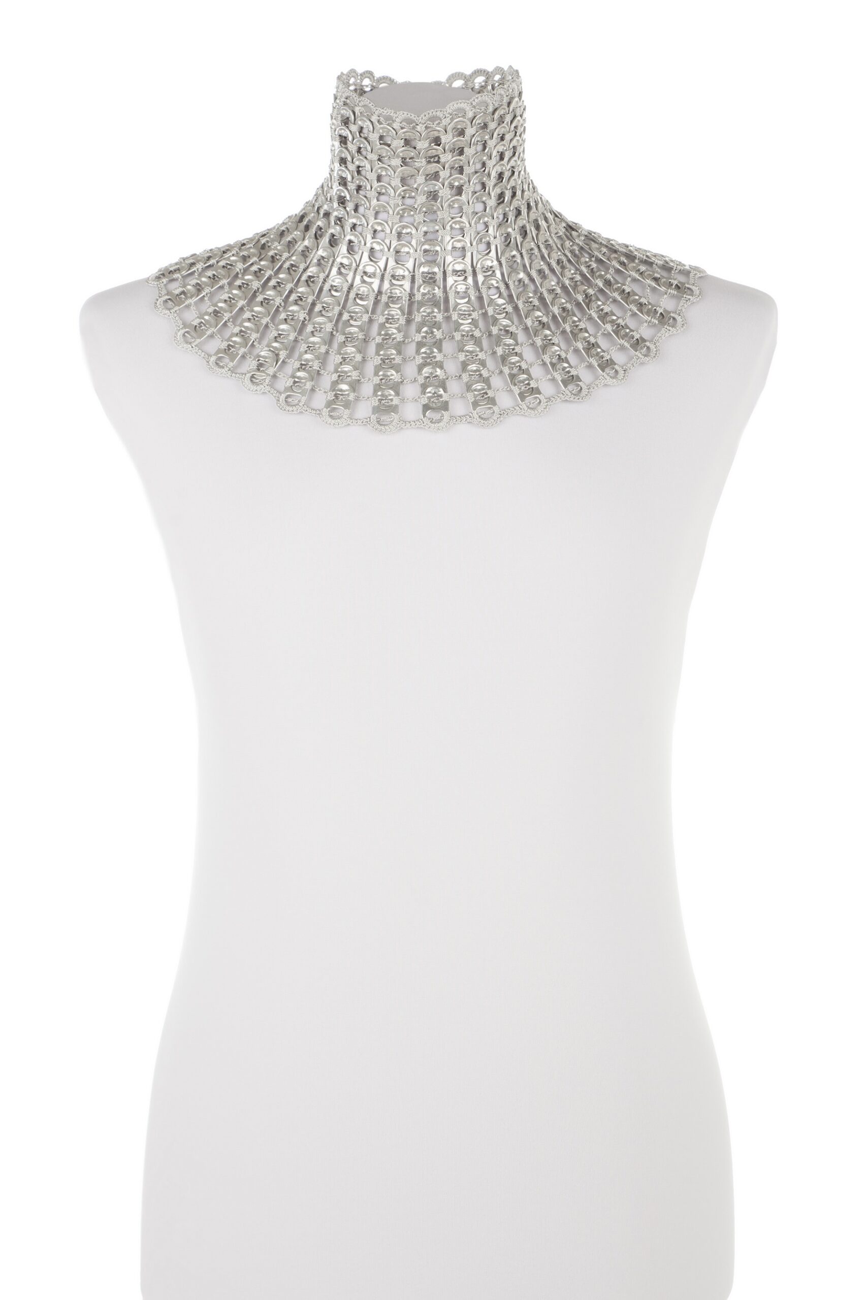 Collana realizzata a mano con linguette riciclate creata con la tecnica dell’uncinetto utilizzando filo di colore grigio chiaro. La chiusura è permessa da due bottoni gioiello in Swarovski.