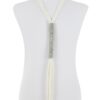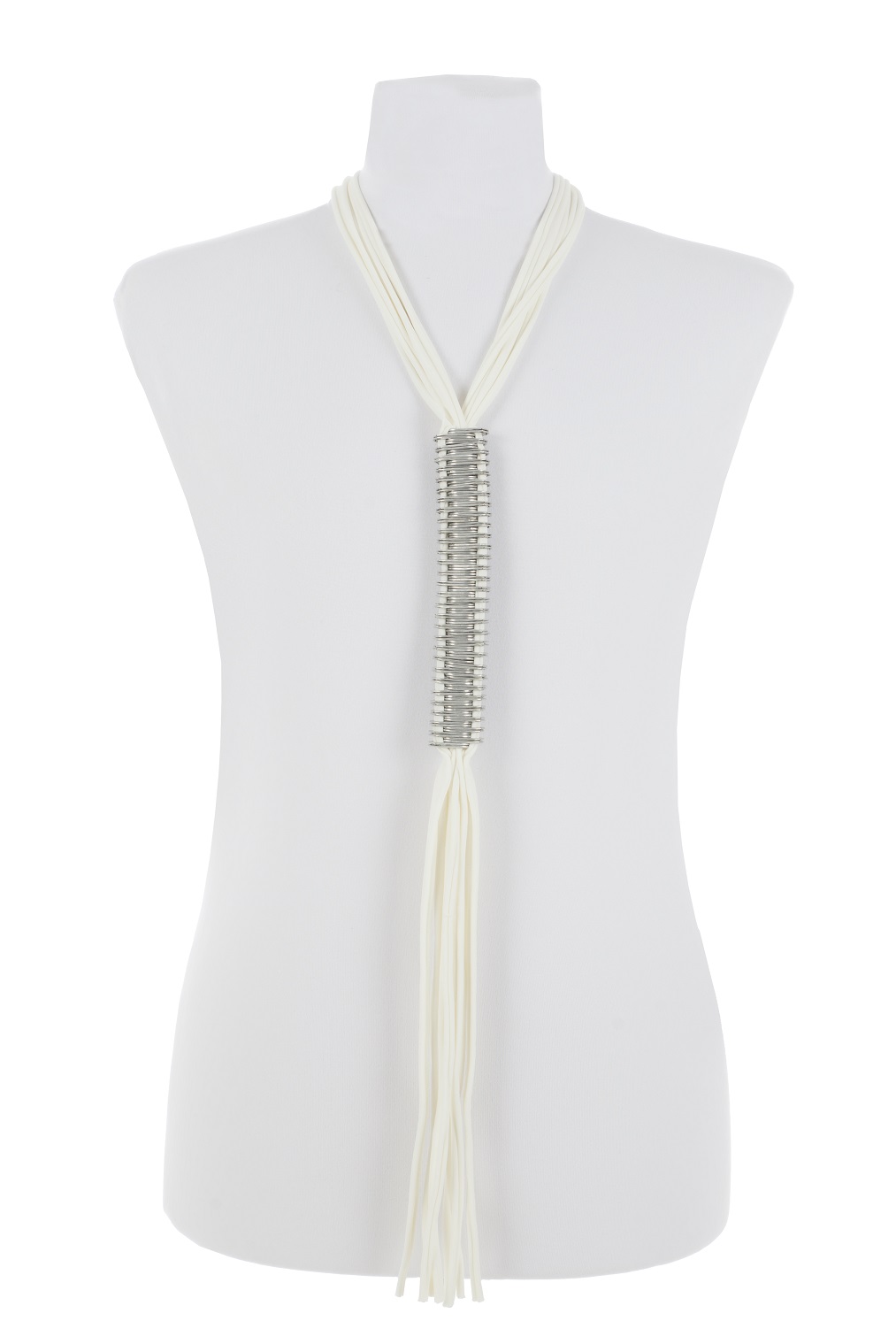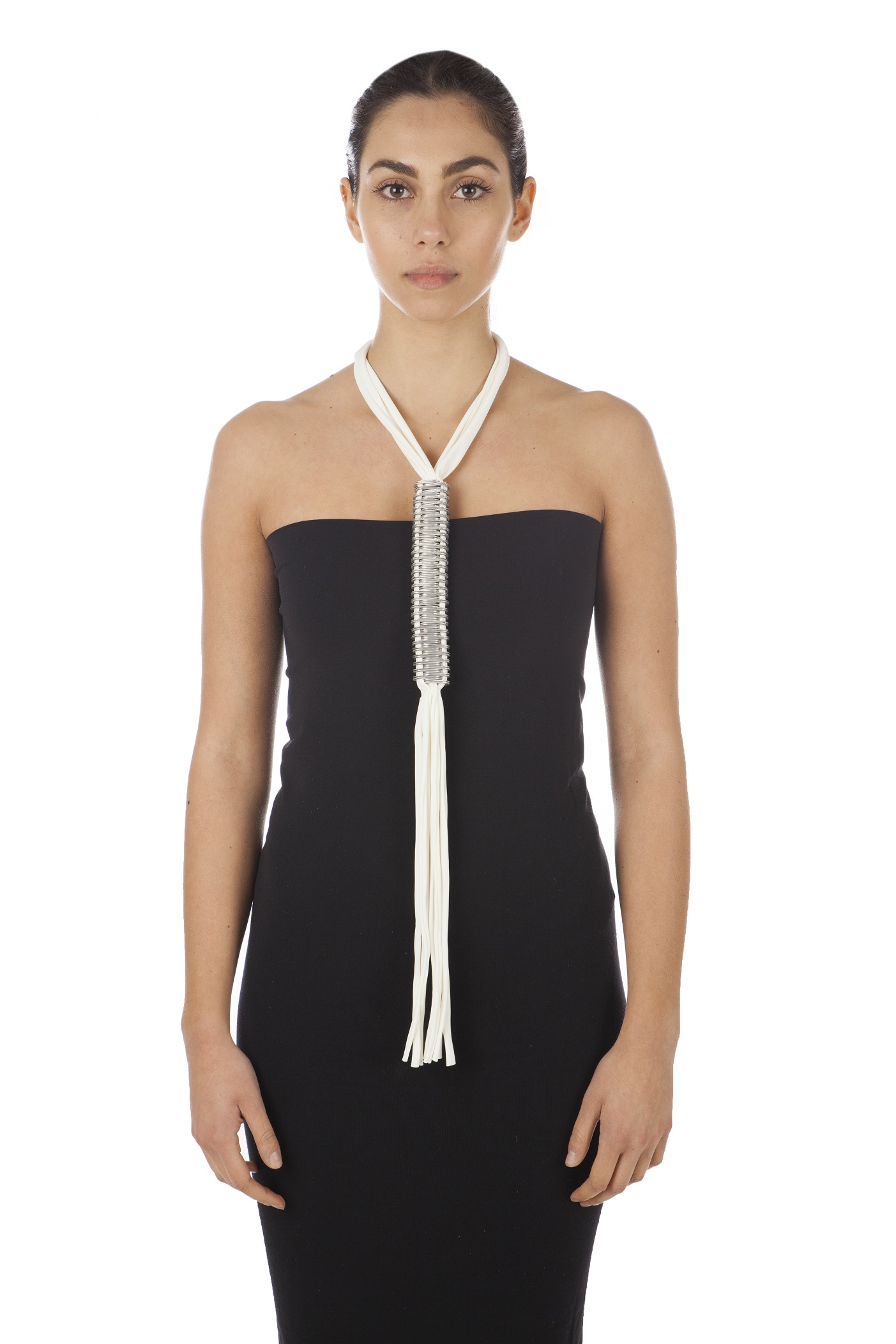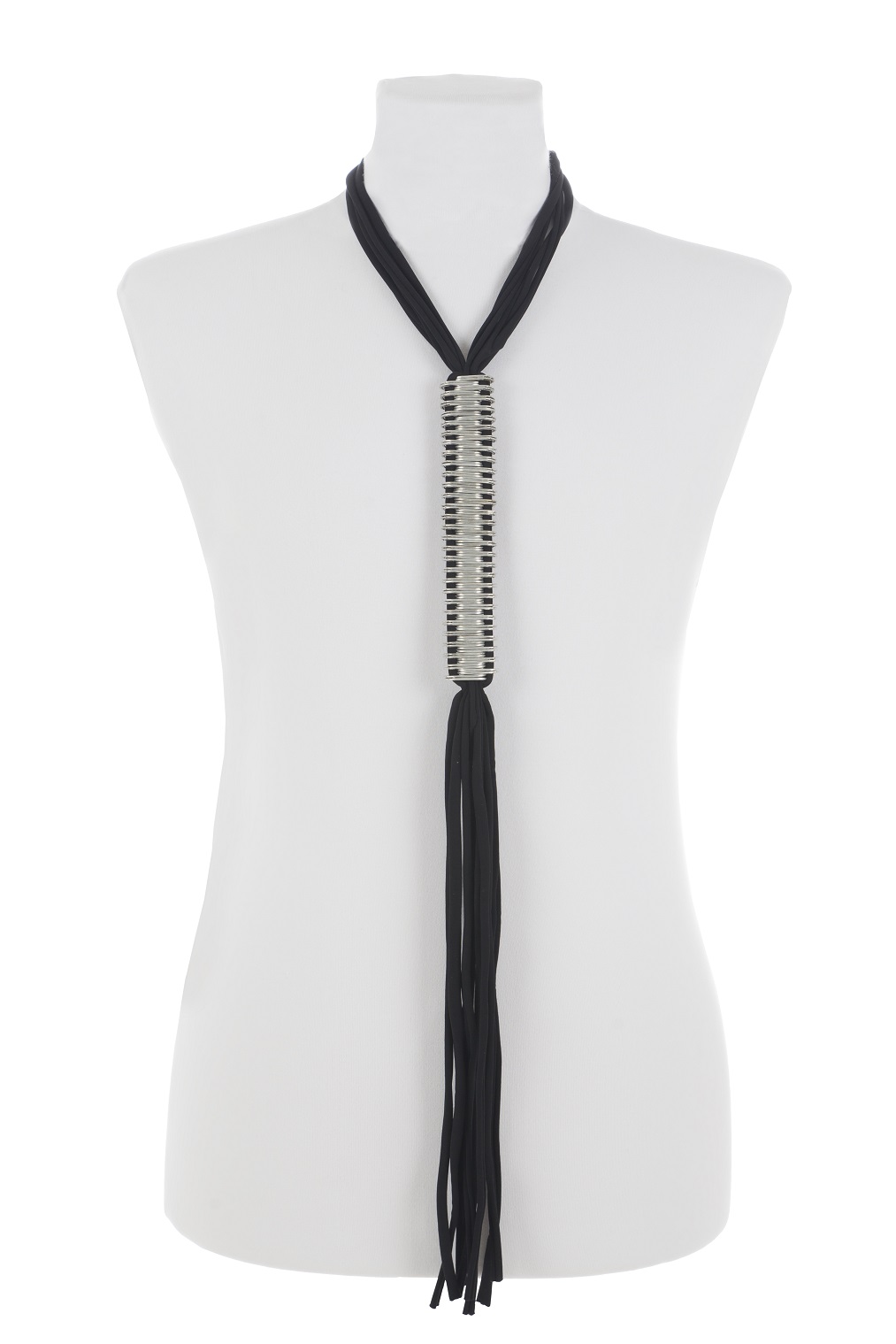 Collana realizzata a mano in Italia con jersey riciclato e linguette in alluminio. Disponibile anche in bianco.
