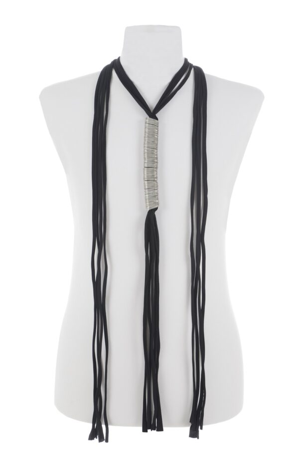 Collana realizzata a mano in Italia con lycra e linguette in alluminio intrecciate.