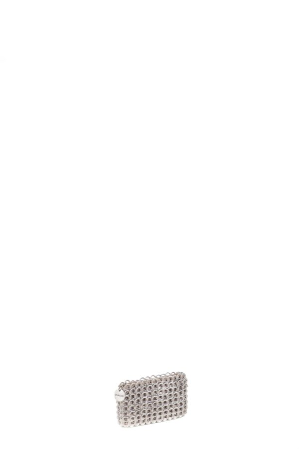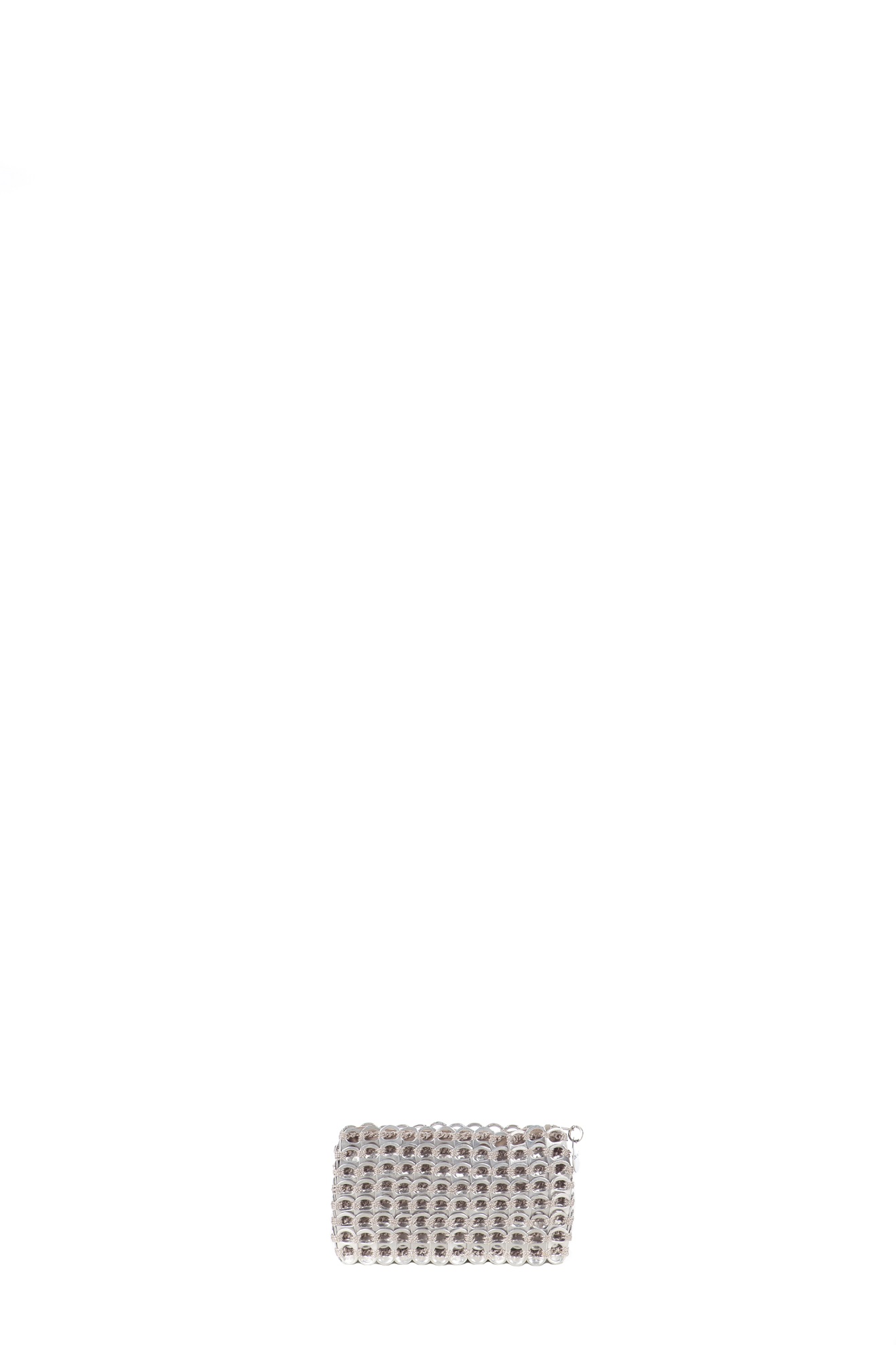 Pochette fatta a mano con linguette delle lattine riciclate e creata con la tecnica dell’uncinetto utilizzando filo di nylon color beige. Di forma rettangolare con chiusura a zip.