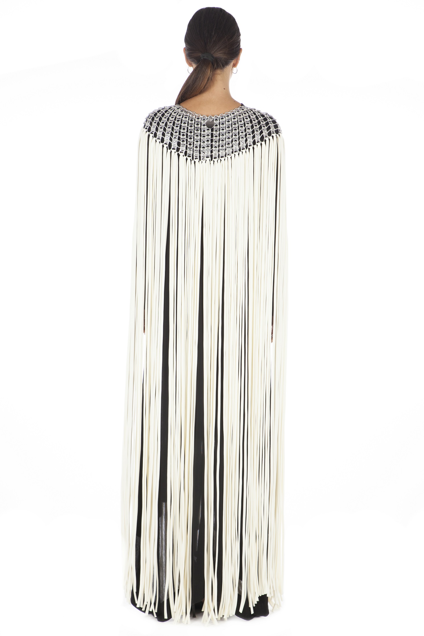 Collana realizzata a mano con linguette delle lattine riciclate e creata con la tecnica dell’uncinetto utilizzando filo di nylon color grigio. Le lunghe frange in lycra sono applicate a mano.